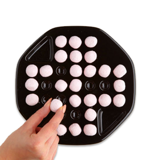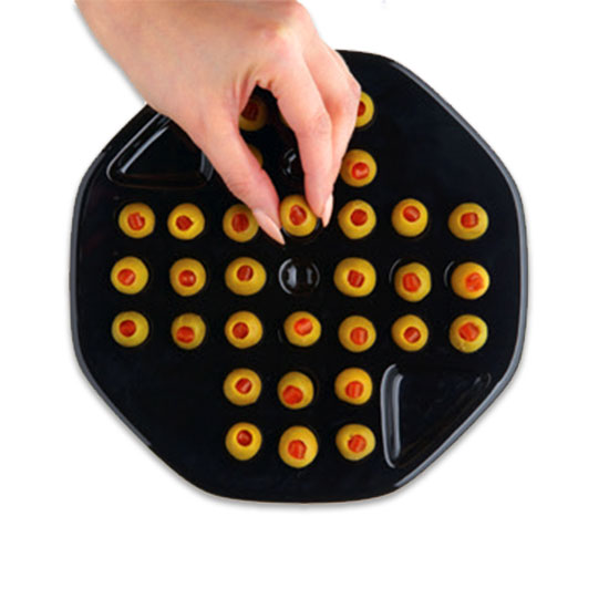 Der perfekte Spaß, um mit Essen zu spielen! Serviere Oliven oder Bonbons auf einzigartige Weise mit diesem Solitaire-Spiel. Markiere den Spielstand auf der Platte mit der mitgelieferten Kreide. In den Aussparungen finden die Olivenkerne Platz.