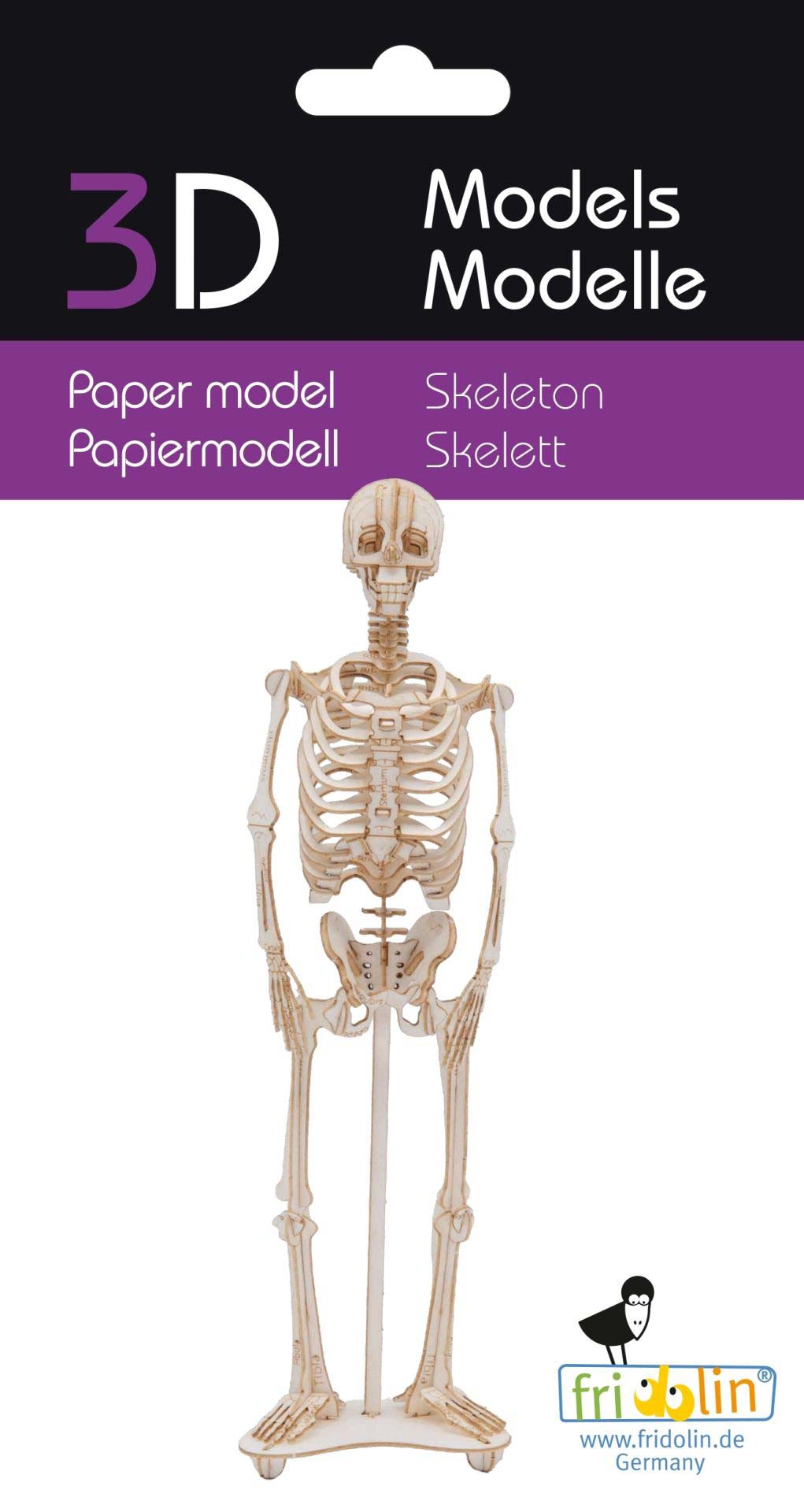 Das 3D Papiermodell "Skelett" ist montiert ca. 6,5 x 23 x 4,5 cm groß. Der Bausatz besteht aus präzise gelasertem Spezialkarton und wird zusammengesteckt.