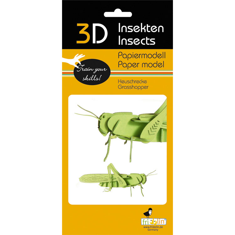 Das 3D Papiermodell "Heuschrecke" ist montiert ca. 10,5 x 3,5 x 5,5 cm groß. Der Bausatz besteht aus präzise gelasertem Spezialkarton und wird zusammengesteckt.