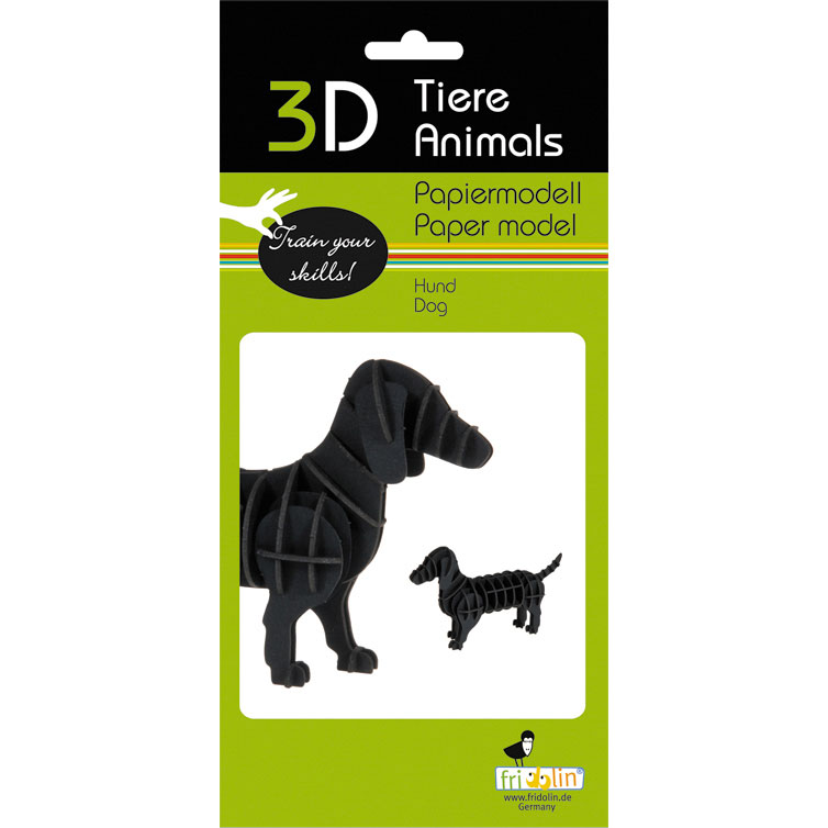Das 3D Papiermodell "Dackel" ist montiert ca. 11 x 6 x 3 cm groß. Der Bausatz besteht aus präzise gelasertem Spezialkarton und wird zusammengesteckt.