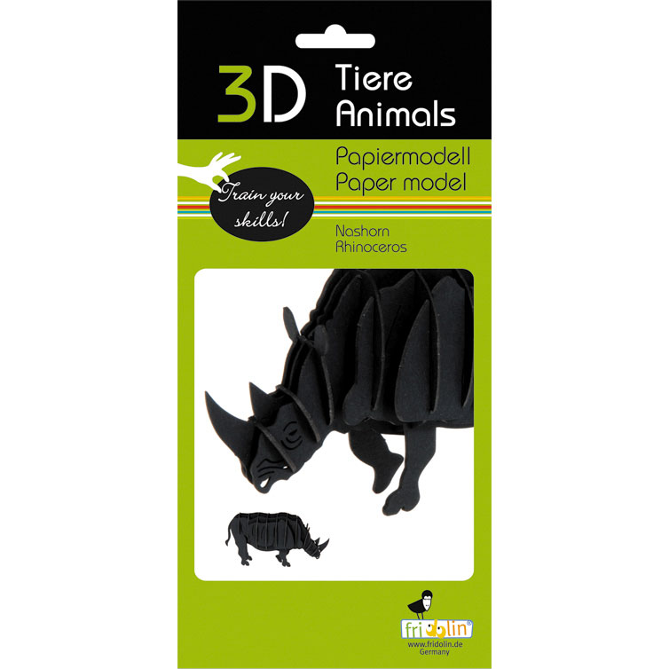 Das 3D Papiermodell "Nashorn" ist montiert ca. 11 x 6 x 3,5 cm groß. Der Bausatz besteht aus präzise gelasertem Spezialkarton und wird zusammengesteckt.