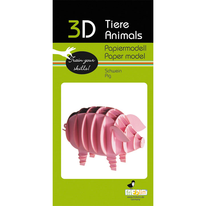 Das 3D Papiermodell "Schwein" ist montiert ca. 9 x 5,5 x 5 cm groß. Der Bausatz besteht aus präzise gelasertem Spezialkarton und wird zusammengesteckt.