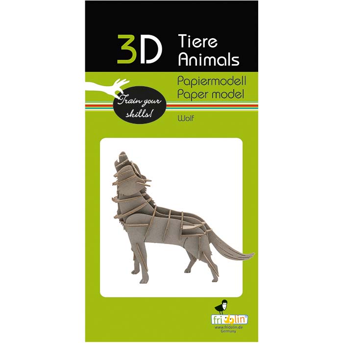 Das 3D Papiermodell "Wolf" ist montiert ca. 11 x 9,5 x 3,5 cm groß. Der Bausatz besteht aus präzise gelasertem Spezialkarton und wird zusammengesteckt.