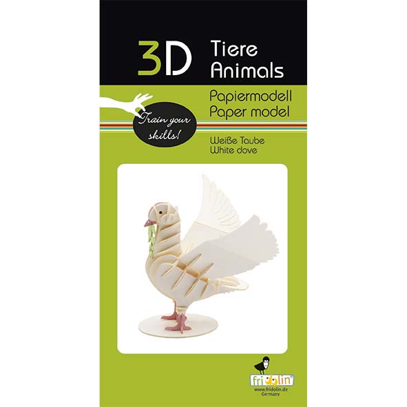 Das 3D Papiermodell "Weiße Taube" ist montiert ca. 7,5 x 8,5 x 8 cm groß. Der Bausatz besteht aus präzise gelasertem Spezialkarton und wird zusammengesteckt.