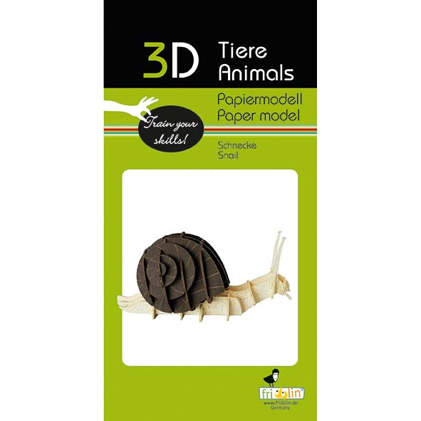Das 3D Papiermodell "Schnecke" ist montiert ca. 9 x 4 x 4 cm groß. Der Bausatz besteht aus präzise gelasertem Spezialkarton und wird zusammengesteckt.