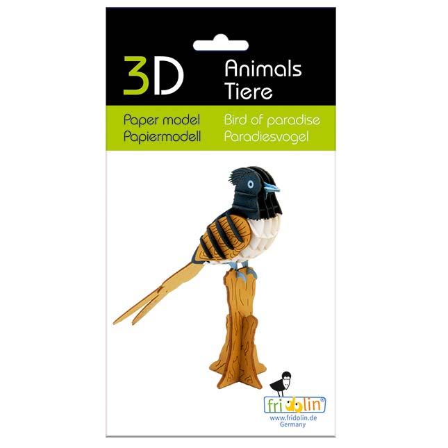 Das 3D Papiermodell "Paradiesvogel" ist montiert ca. 13 x 12 x 4 cm groß. Der Bausatz besteht aus präzise gelasertem Spezialkarton und wird zusammengesteckt.