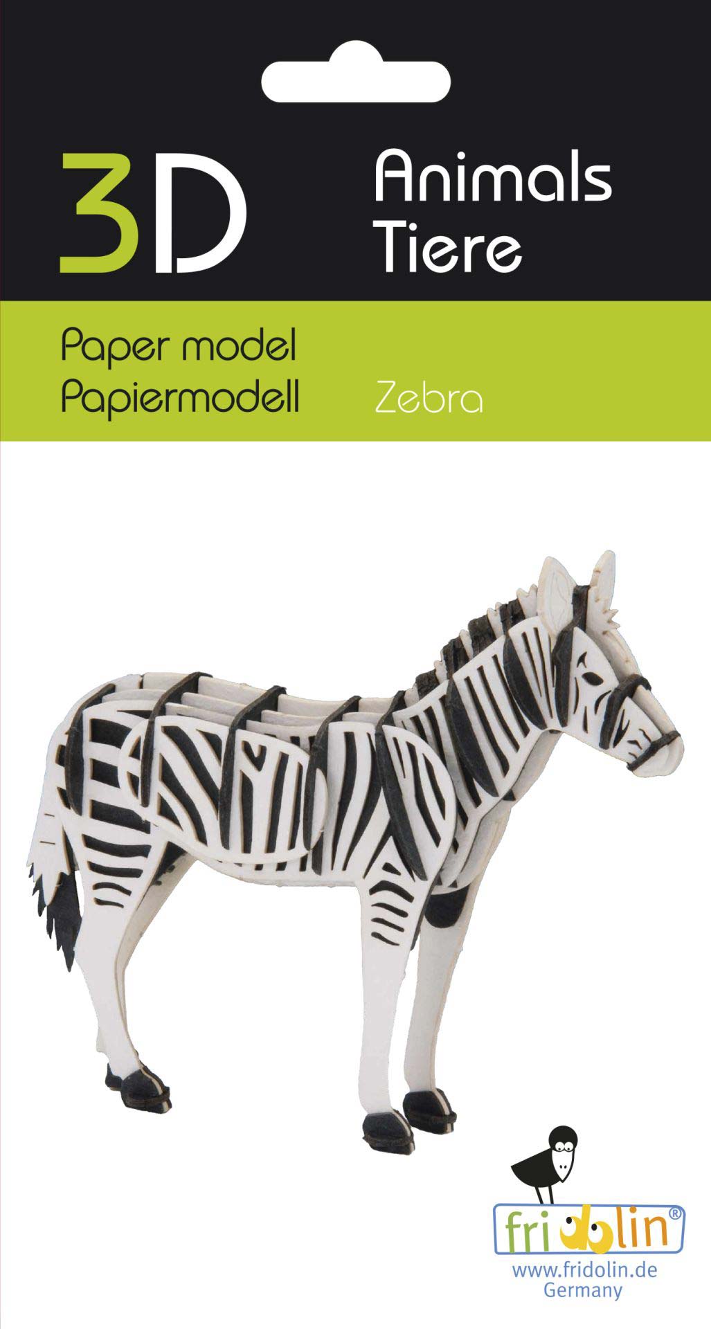 Das 3D Papiermodell "Zebra" ist montiert ca. 10 x 7,5 x 3 cm groß. Der Bausatz besteht aus präzise gelasertem Spezialkarton und wird zusammengesteckt.