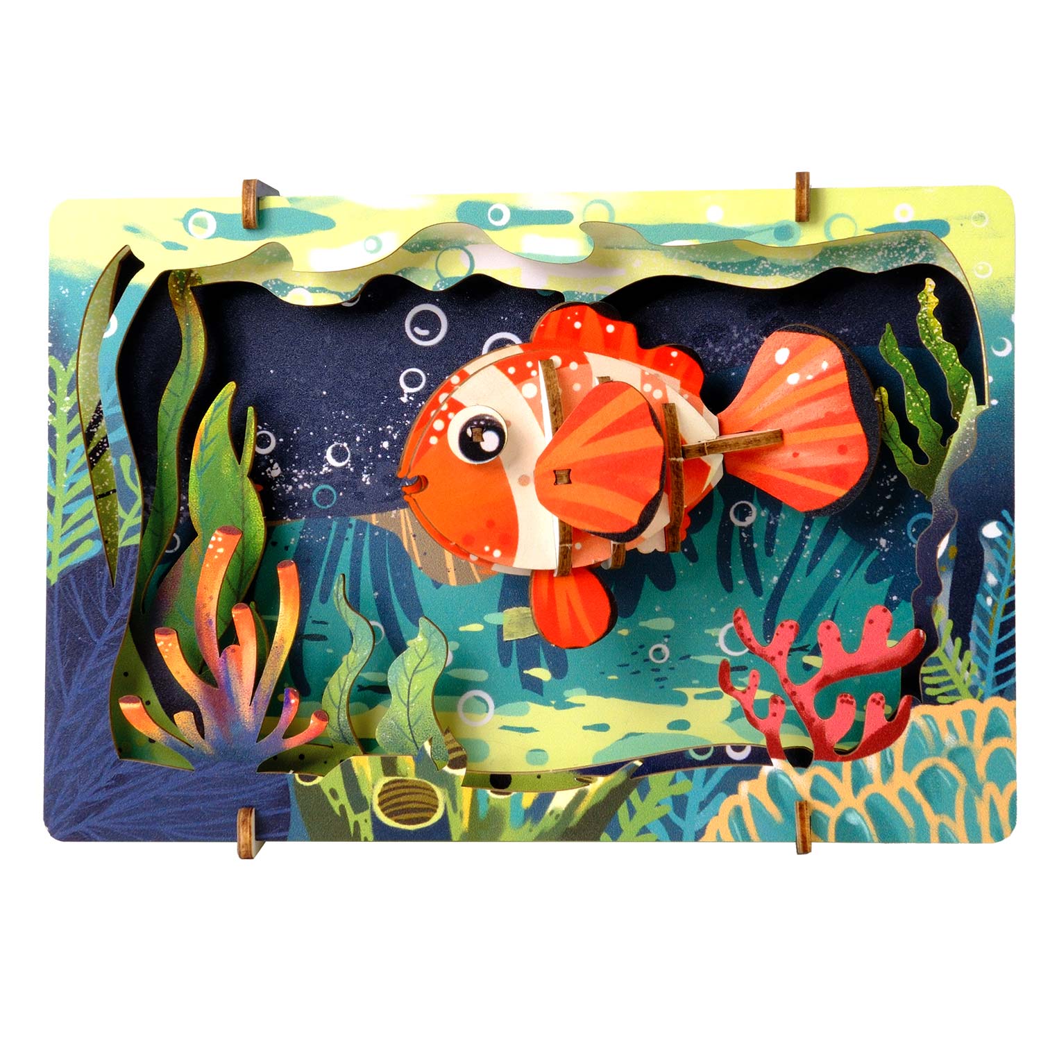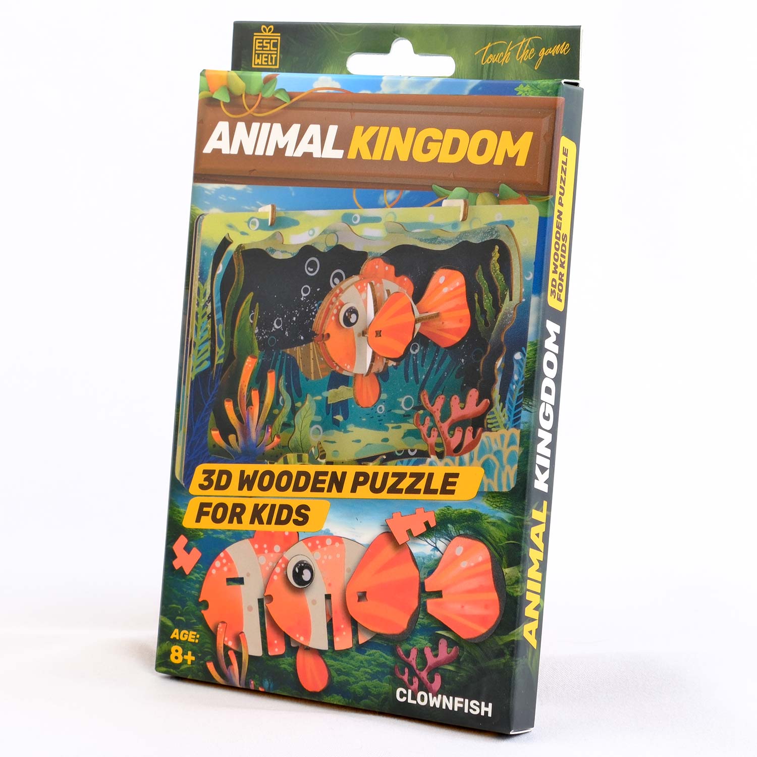 Der 3D Holzbausatz Clownfish für Kinder. Das Modell besteht aus 90 Holzteilen, die bereits gefärbt sind und nur noch aus den Holzplatten herausgetrennt und zusammengebaut werden müssen. Die Bausätze sind extra für Kinder entwickelt worden und sind einfach im Zusammenbau.