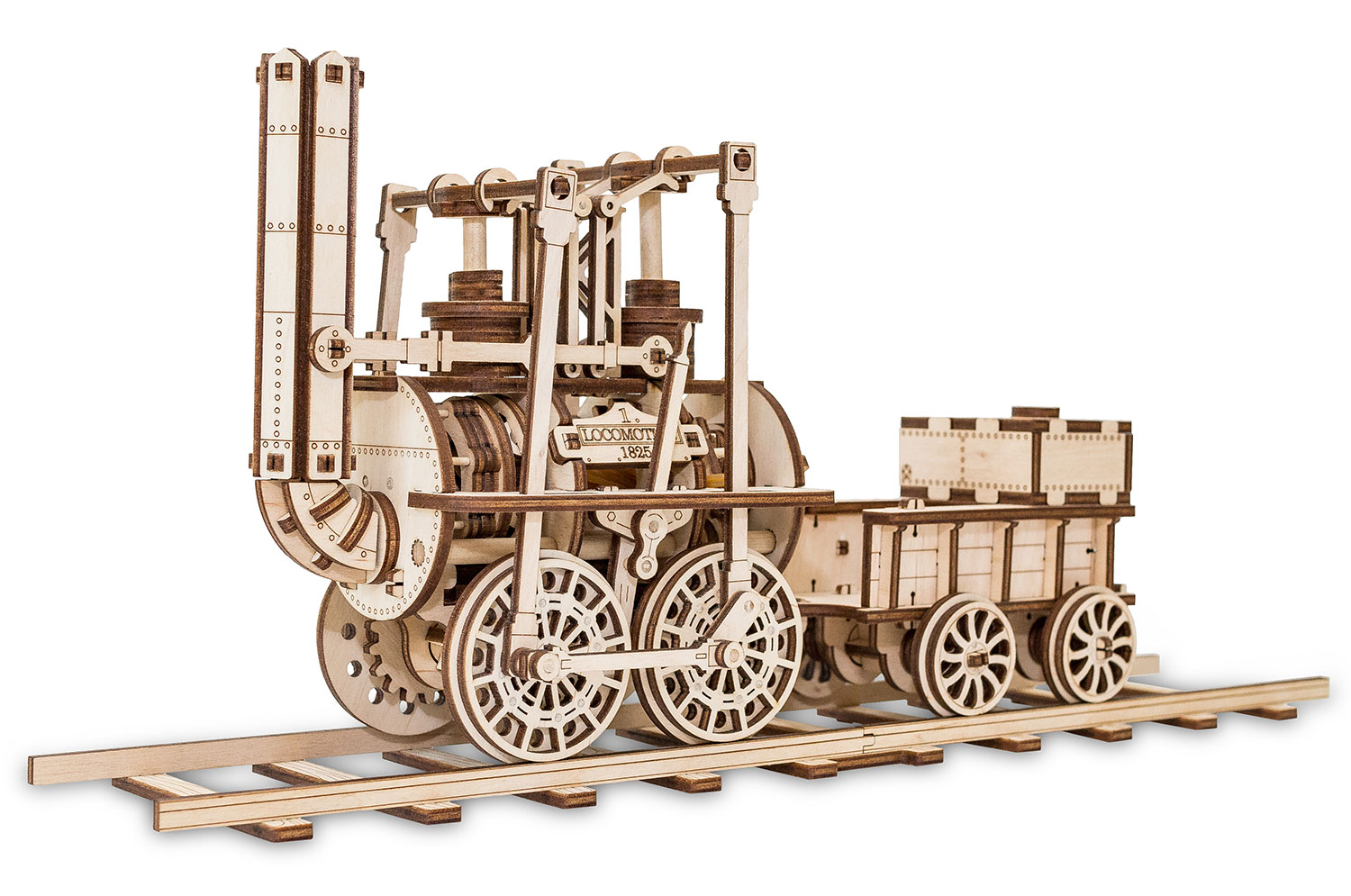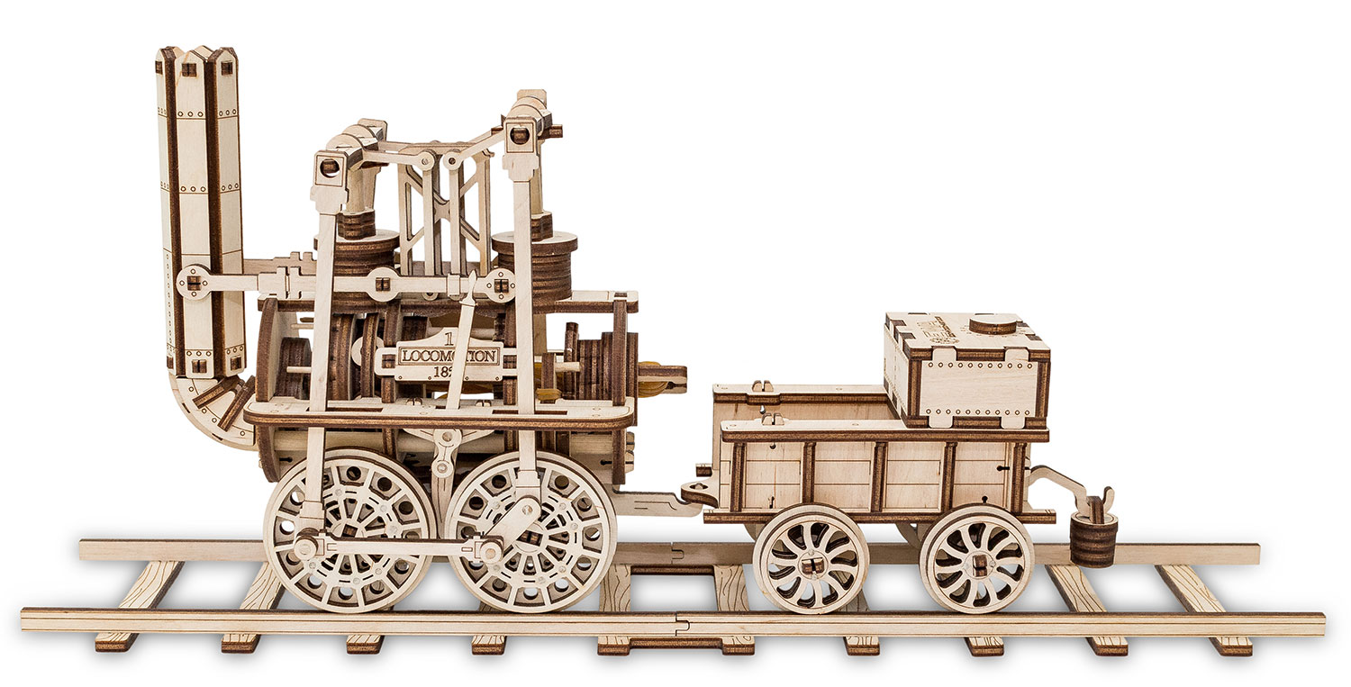 Die Lokomotive Nr. 1 fuhr im Jahr 1825 als erste Strecke die 9 Meilen zwischen Stockton nach Darlinton in Großbritannien. Der Bausatz von Eco Wood Art stellt diese Lokomotive in eindrucksvoller Art nach. Das aus 325 Teilen bestehende Modell besitzt einen Aufziehmotor, der die Lok mitsamt Anhänger von alleine durch die Gegend fahren läßt. Dabei ist die Kraftübertragung vom Motor auf die Räder eindrucksvoll zu sehen. Im Lieferumfang enthalten sind auch ein kurzes Stück Schienen zur Präsentation des Modells.