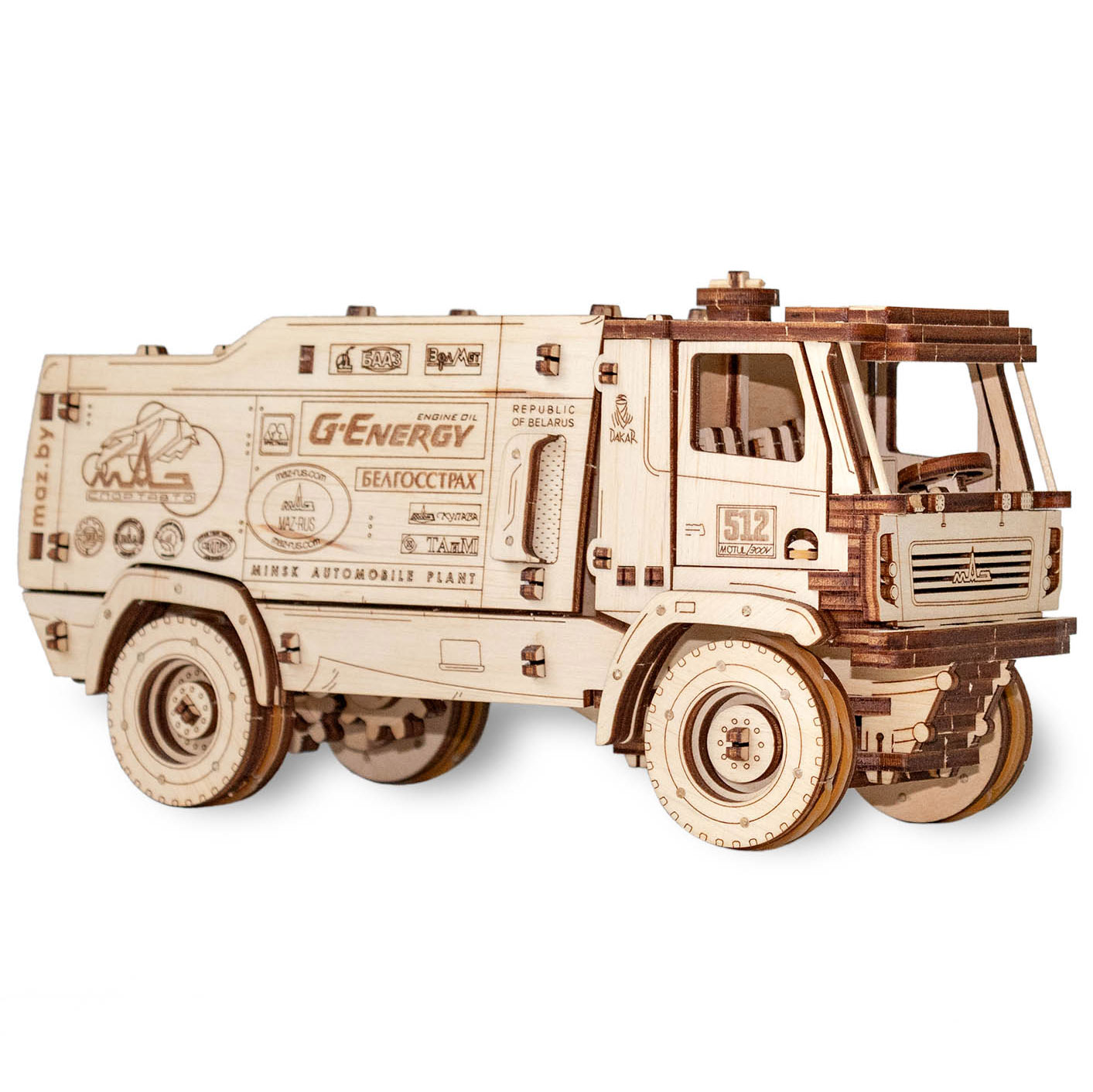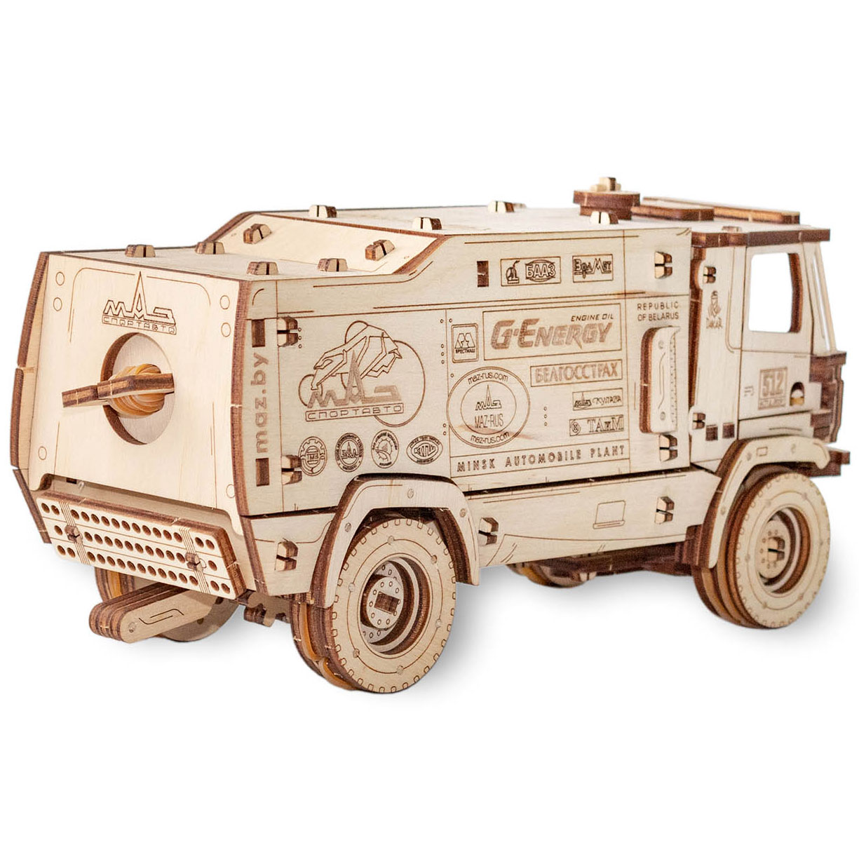 Der MAZ 5309RR von Eco Wood Art ist ein Rally Truck, der in Zusammenarbeit mit der Minsk Automobile Plant entstanden ist. Das zusammengebaute Modell fährt mit Hilfe eines Aufziehmotors, der mit Gummibändern arbeitet, selbstständig vorwärts. Die Türen lassen sich öffnen und der Aufbau ist mit Sponsorenlogos graviert.