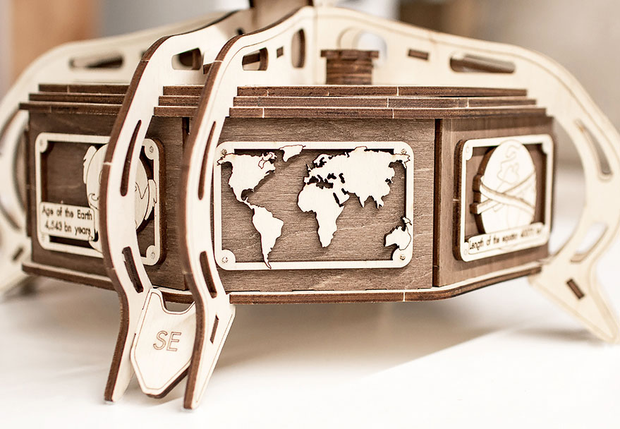 Der schön gestaltete Sockel ist mit einigen interessanten Fakten über die Erde verziert. Außerdem befindet sich im Sockel ein Geheimfach, dessen Hebel zum Öffnen erst durch Drehen eines Zahnrades zugänglich wird.