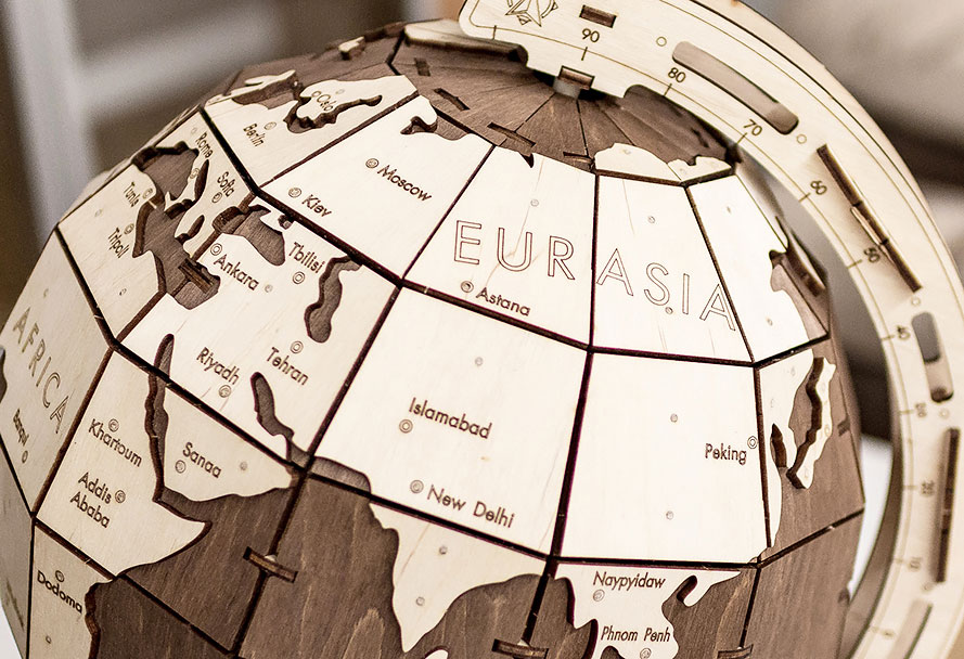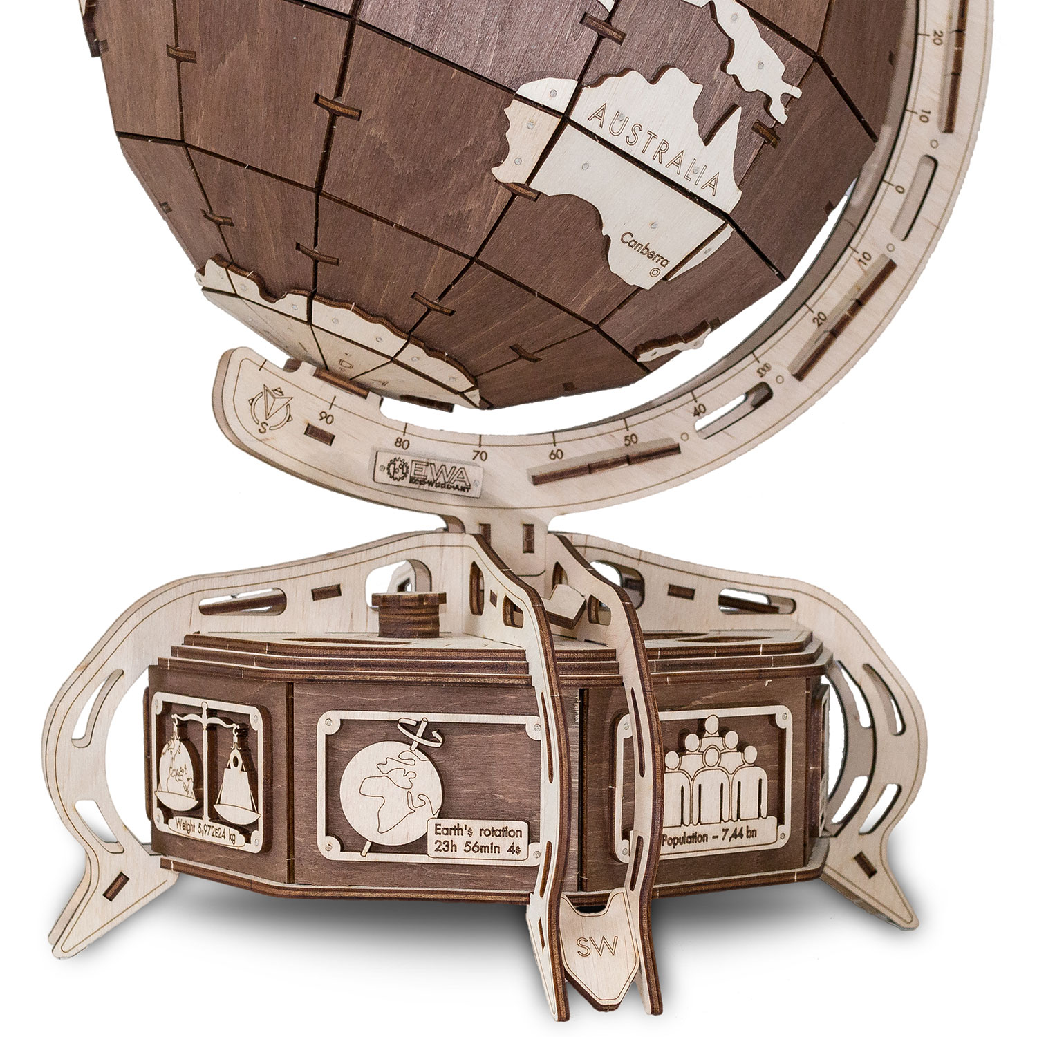 Der Globus von Eco Wood Art in der braunen Ausführung. Das Modell wird aus 393 Teilen zusammengebaut und ist genau das, was man von einem Globus erwartet: Ein 3D-Modell der Erde. Alle Kontinente sind abgebildet und werden durch die Markierung einiger großer Städte ergänzt. Der Globus rotiert um eine Achse, damit man sich alle Kontinente genau anschauen kann.