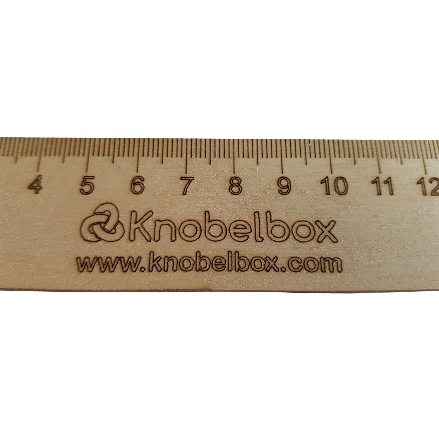 Holz-Lineal mit Knobelbox-Branding. Das Lineal wurde aus nachwachsendem Holt hergestellt und per Laser graviert.