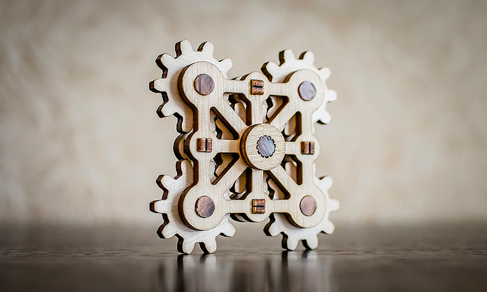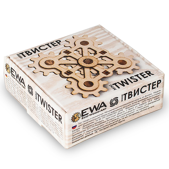Der Mini Twister von Eco Wood Art ist ein kleiner Bausatz für Einsteiger. Das Modell besteht aus 18 Teilen. Die Zahnräder sind alle miteinander verbunden und drehen sich immer gleichzeitig.