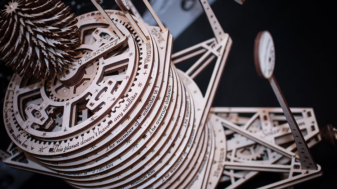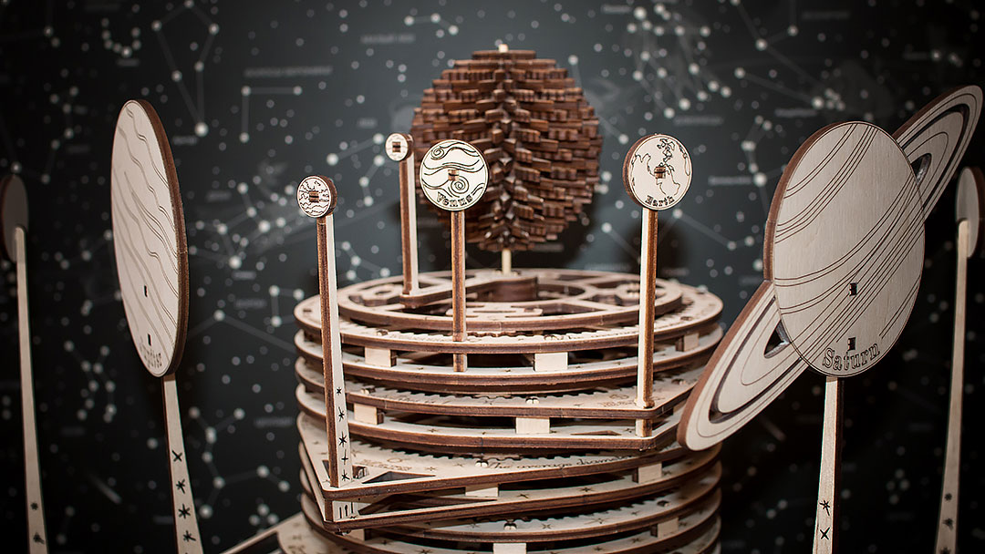 Das Planetarium von Eco Wood Art ist ein wahres Meisterwerk. Bei der Entwicklung des Bausatzes wurde die Unterstützung von Astronomen hinzugezogen, um eine realitätsnahe Simulation des Sonnensystems bauen zu können. In Aktion kann man anhand des Modells beobachten, wie sich die Planeten um die Sonne bewegen.
