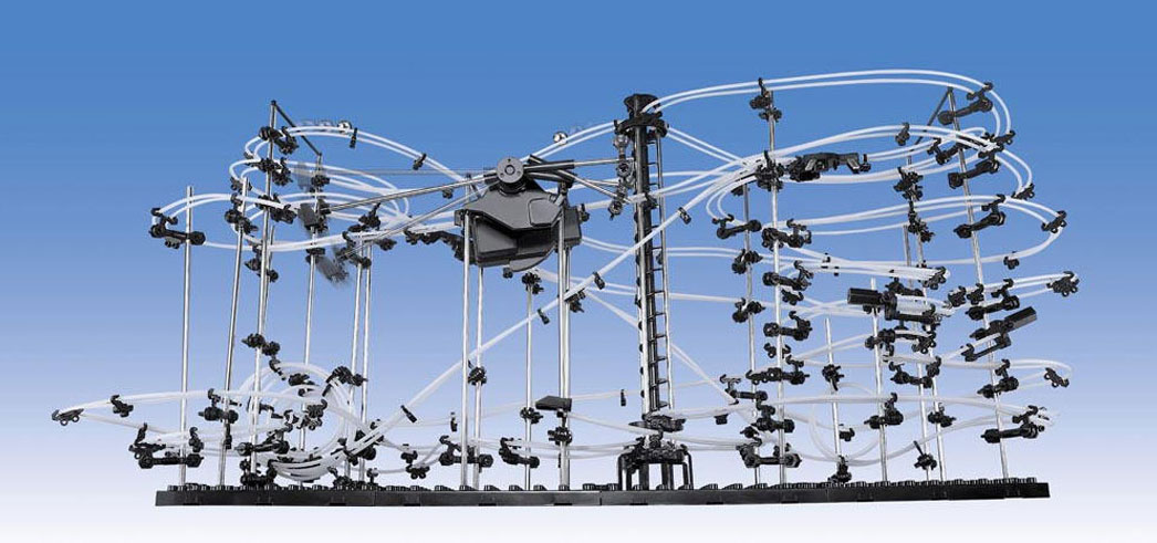 Der Star Coaster mit Aufbau-Level 5: Wer denkt, dass Kugelbahnen nur etwas für Kinder sind, der wird hier eines Besseren belehrt. Denn Spacerail ist eine geniale, spektakuläre Kugel-Achterbahn mit aberwitzigen Abfahrten über atemberaubende Steilstrecken, durch Loopings und rasante Kurven. Eine krasse Herausforderung für jugendliche und erwachsene Tüftelfans, deren Herzen hier garantiert höher schlagen. In verschiedenen Levels mit unterschiedlichen Größen und Schwierigkeitsgraden erhältlich. Das ausgeklügelte System besteht aus jeweils 1 Bodenplatte, auf der aus Metallelementen, flexiblen Plastikrohren, Weichen, Wippen und Dreharmen eine anspruchsvolle Kugelbahn konstruiert wird, auf der die mitgelieferten Metallkugeln in atemberaubendem Tempo hinuntersausen. Anspruch, Größe und Komplexität der Kugelbahnen steigen dabei mit jedem Level. Der absolute Clou: Nach einer rasanten Abfahrt landet die Kugel im batteriebetriebenen Fahrstuhl, der die Kugeln wieder nach oben in ihre Startpositionen bringt - und schon kann die nächste Abfahrt beginnen. Bereits der Aufbau ist Herausforderung und Riesenspaß zugleich: Er kann je nach Level von mehreren Stunden bis zu mehreren Tagen dauern. Für Level 9 empfehlen wir einen akademischen Abschluss möglichst mit Doktortitel! Inklusive ausführlicher und bebilderter Aufbauanleitung in deutscher und englischer Sprache.