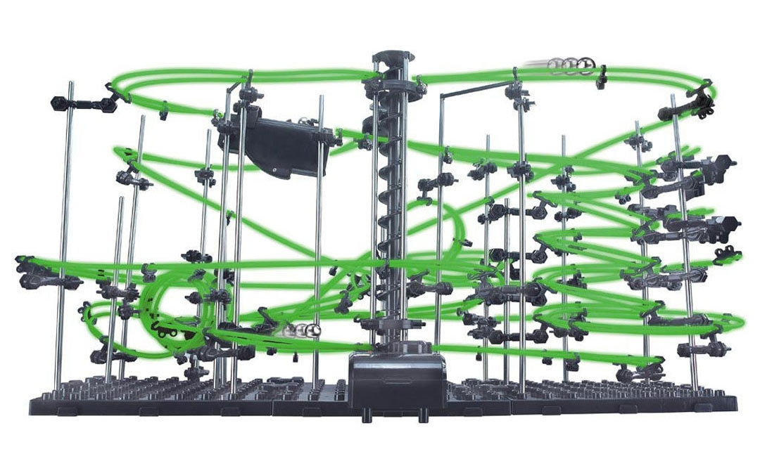 Der Star Coaster mit Aufbau-Level 3: Doppelter Spaß, denn diese Kugelbahn leuchtet bei Dunkelheit. Wer denkt, dass Kugelbahnen nur etwas für Kinder sind, der wird hier eines Besseren belehrt. Denn Spacerail ist eine geniale, spektakuläre Kugel-Achterbahn mit aberwitzigen Abfahrten über atemberaubende Steilstrecken, durch Loopings und rasante Kurven. Eine krasse Herausforderung für jugendliche und erwachsene Tüftelfans, deren Herzen hier garantiert höher schlagen. In verschiedenen Levels mit unterschiedlichen Größen und Schwierigkeitsgraden erhältlich. Das ausgeklügelte System besteht aus jeweils 1 Bodenplatte, auf der aus Metallelementen, flexiblen Plastikrohren, Weichen, Wippen und Dreharmen eine anspruchsvolle Kugelbahn konstruiert wird, auf der die mitgelieferten Metallkugeln in atemberaubendem Tempo hinuntersausen. Anspruch, Größe und Komplexität der Kugelbahnen steigen dabei mit jedem Level. Der absolute Clou: Nach einer rasanten Abfahrt landet die Kugel im batteriebetriebenen Fahrstuhl, der die Kugeln wieder nach oben in ihre Startpositionen bringt - und schon kann die nächste Abfahrt beginnen. Bereits der Aufbau ist Herausforderung und Riesenspaß zugleich: Er kann je nach Level von mehreren Stunden bis zu mehreren Tagen dauern. Für Level 9 empfehlen wir einen akademischen Abschluss möglichst mit Doktortitel! Inklusive ausführlicher und bebilderter Aufbauanleitung in deutscher und englischer Sprache.