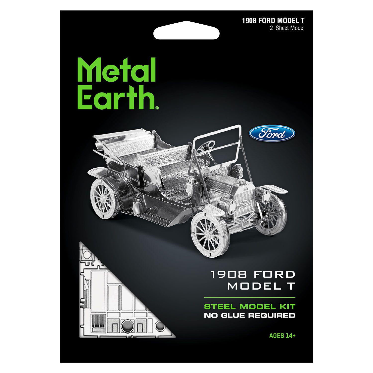 Das Modell Ford 1908 Model T von Metal Earth aus der Silver Edition besteht aus 2 Metallbögen (11 x 11 cm) und ist 8,9 x 5 x 4,6 cm groß.
