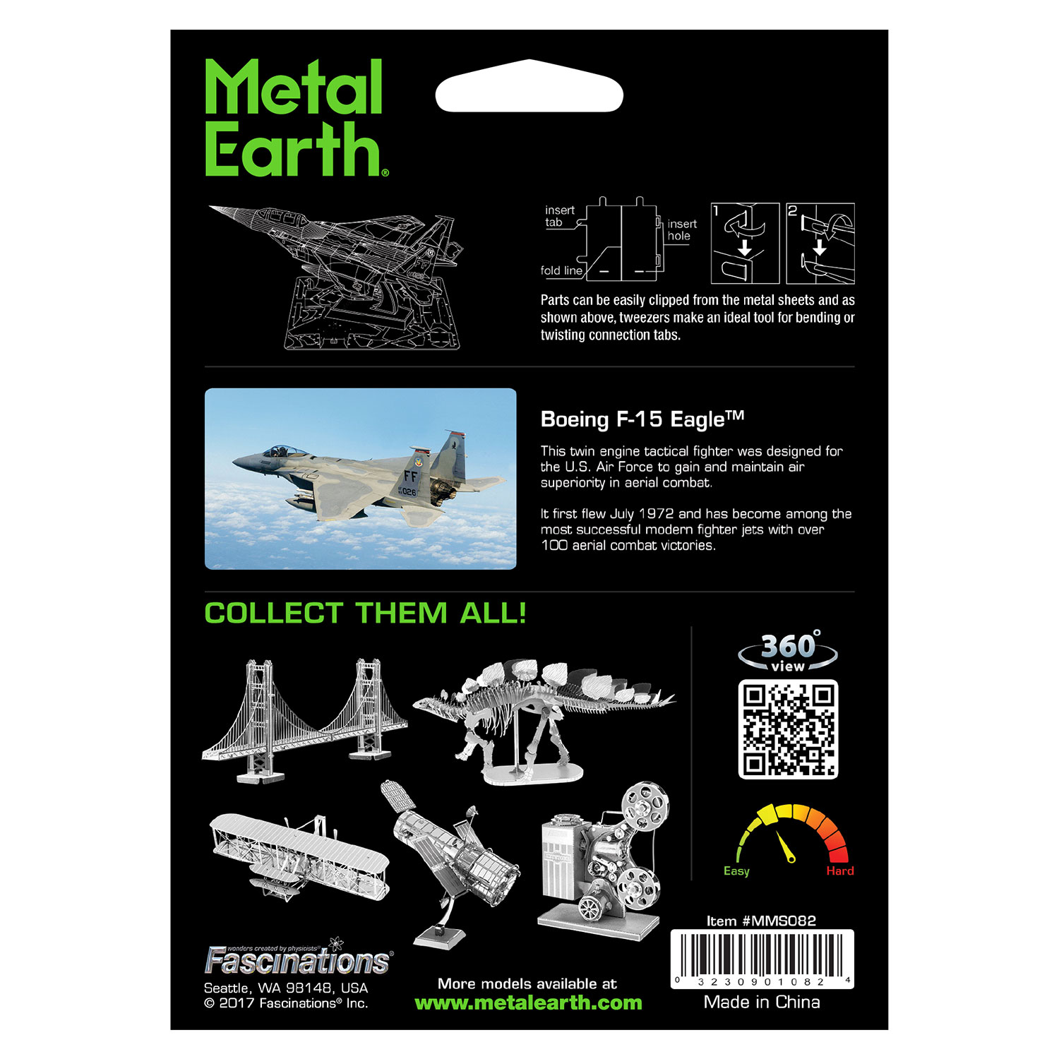 Das Modell F-15 Eagle von Metal Earth besteht aus 1 Metallbogen (11 x 11 cm) und ist 8,7 x 5,9 x 3,2 cm groß.