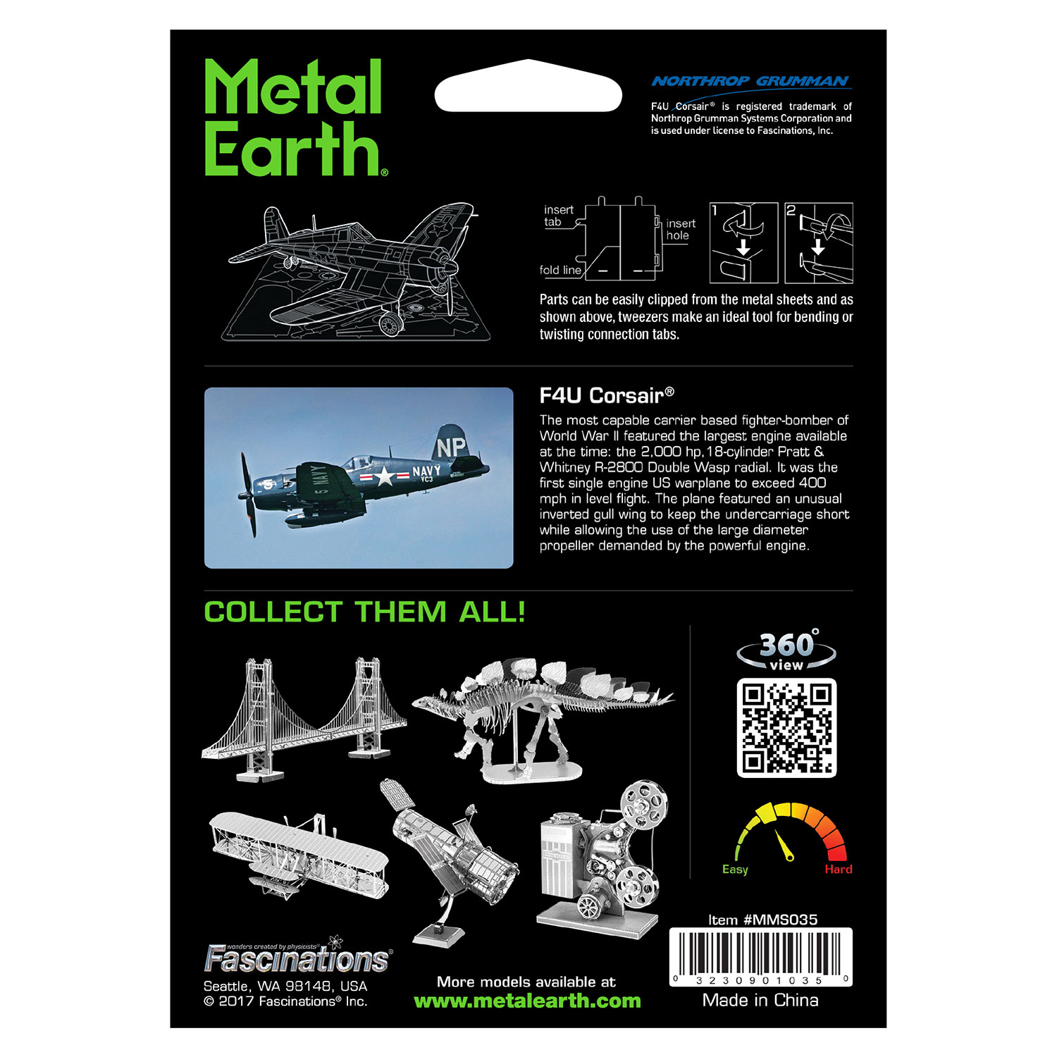 Das Modell F4U Corsair von Metal Earth besteht aus 1 Metallbogen (11 x 11 cm) und ist 11,4 x 9,4 x 3,8 cm groß.
