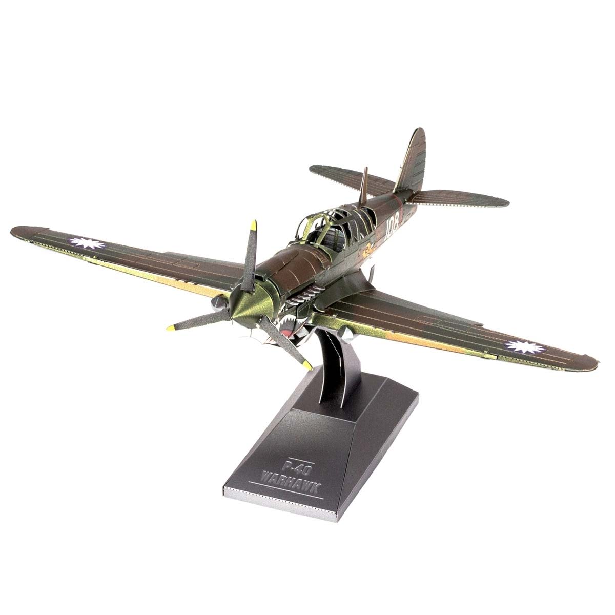Das Modell P-40 Warhawk von Metal Earth besteht aus 2 Metallbögen (11 x 11 cm) und ist 10,9 x 13,2 x 7.9 cm groß.