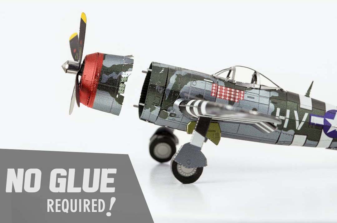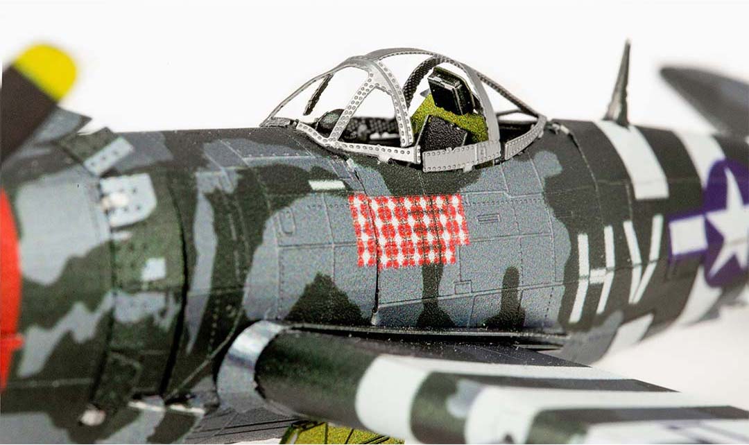 Das Modell P47-Thunderbolt von Metal Earth besteht aus 2 Metallbögen (11 x 11 cm) und ist 13,5 x 11,4 x 4,8 cm groß.