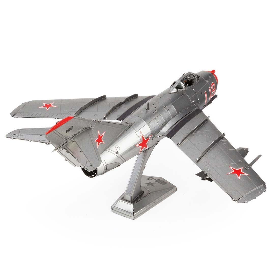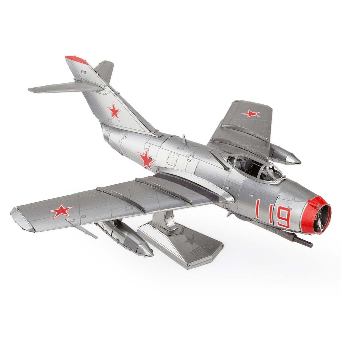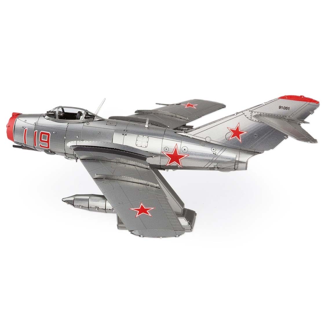 Das Modell MIG-15 von Metal Earth besteht aus 3 Metallbögen (11 x 11 cm) und ist aufgebaut 15,2 x 14,6 x 7 cm groß. Die MiG-15 ist ein einsitziges, einstrahliges sowjetisches Jagdflugzeug, das von dem russischen Luft- und Raumfahrt- sowie Rüstungsunternehmen Mikojan-Gurewitsch (MiG) gebaut wurde. Sie wurde während des Koreakriegs (195053) umfangreich im Kampf eingesetzt. Als sie erstmals im Koreakrieg eingeführt wurde, waren die Vereinigten Staaten schockiert von der Geschwindigkeit, der Steigfähigkeit und der hohen Einsatzhöhe des Flugzeugs. Als Reaktion darauf beeilten sich die USA, das neue F-86 Sabre-Jagdflugzeug einzuführen, um die amerikanische Luftherrschaft im Krieg wiederherzustellen.