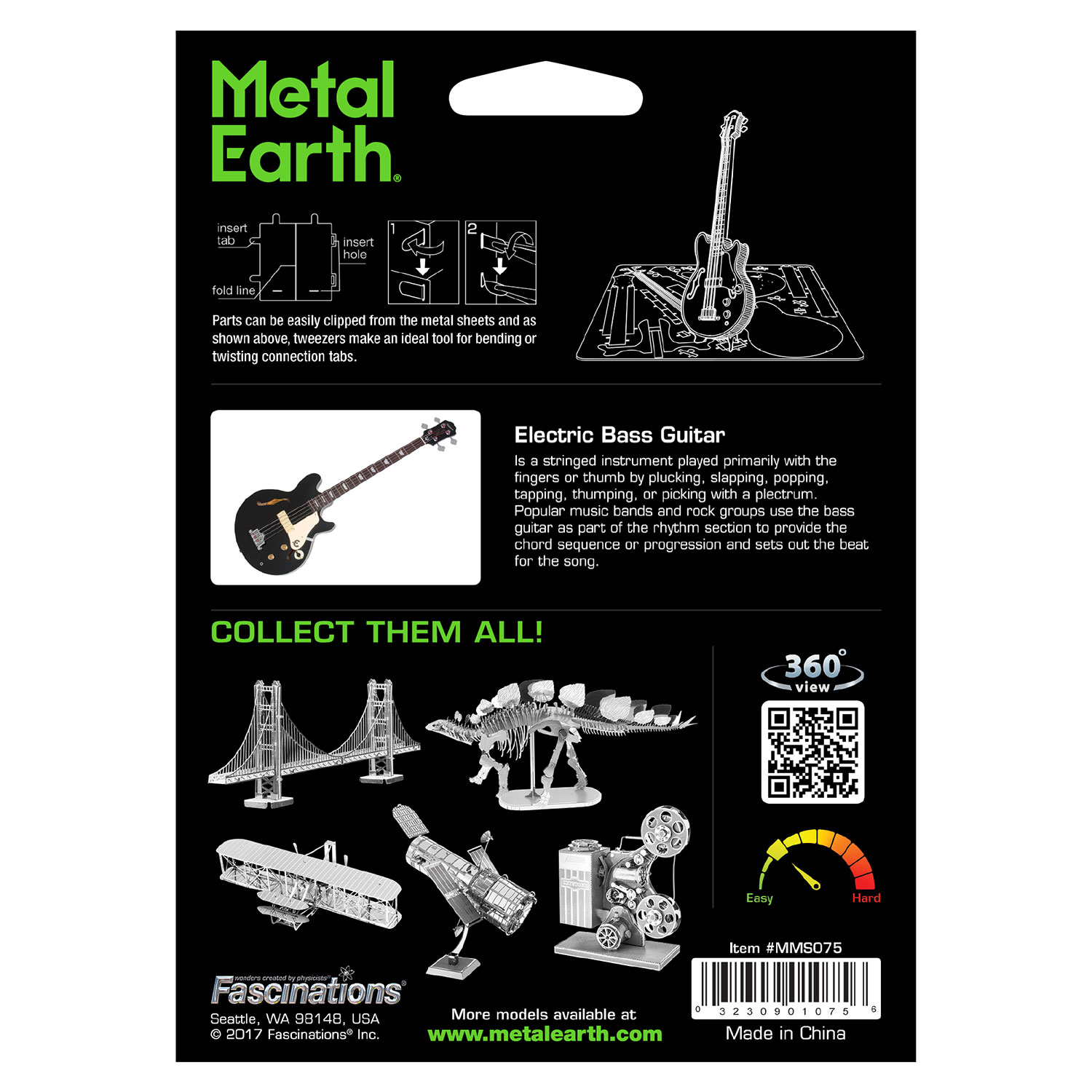 Das Modell Electric Bass Guitar von Metal Earth besteht aus 1 Metallbogen (11 x 11 cm) und ist 11,5 x 4 x 3,2 cm groß.
