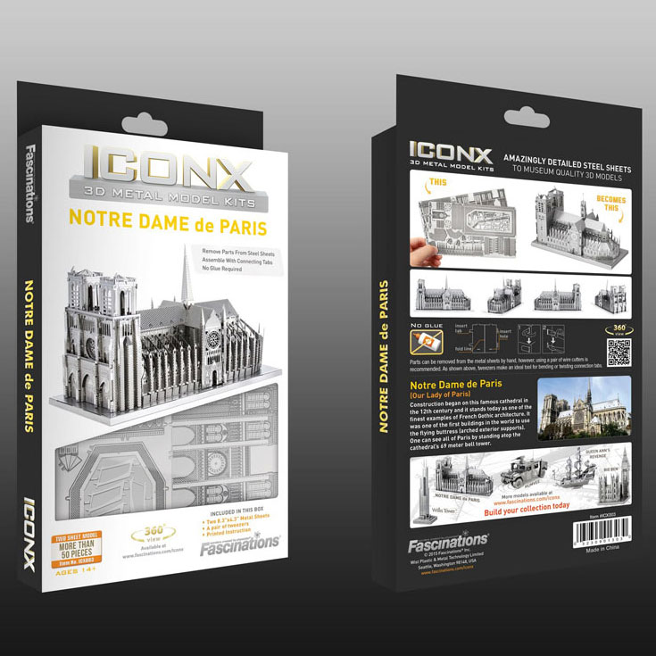 Der Bausatz aus der Premium Series Notre Dame von Metal Earth besteht aus 2 Metallbögen (10 x 20 cm) und ist 8,1 x 11,7 x 5,1 cm groß.