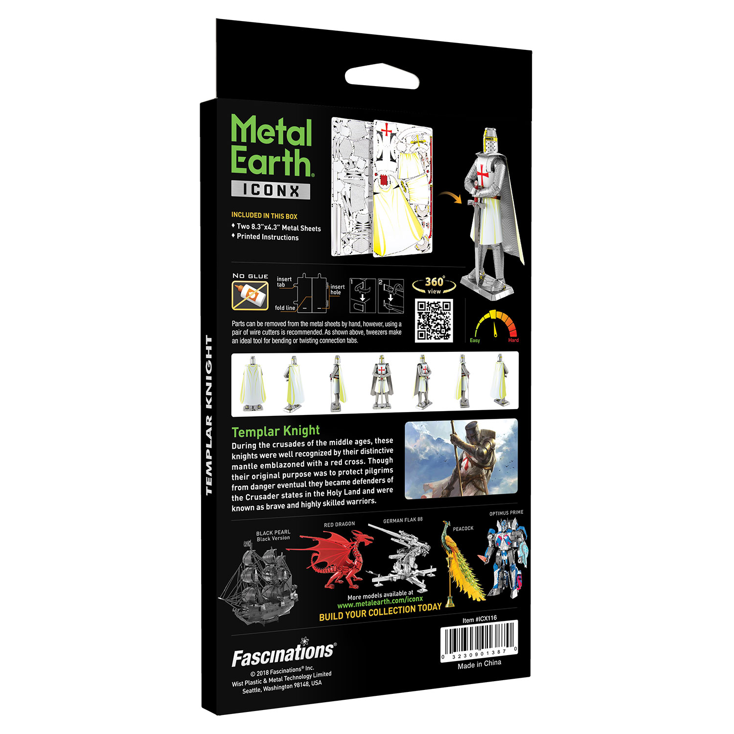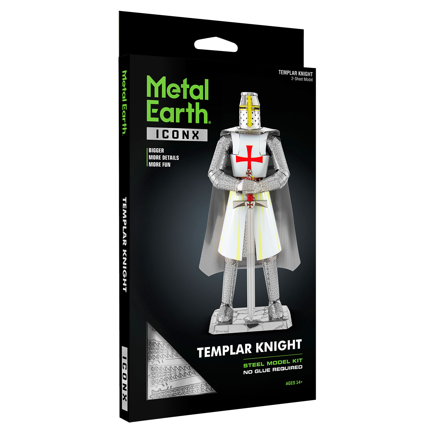 Der Bausatz aus der Premium Series Templar Knight (Tempelritter) von Metal Earth besteht aus 2 Metallbögen (10 x 20 cm) und ist 6,8 x 5 x 14,8 cm groß.