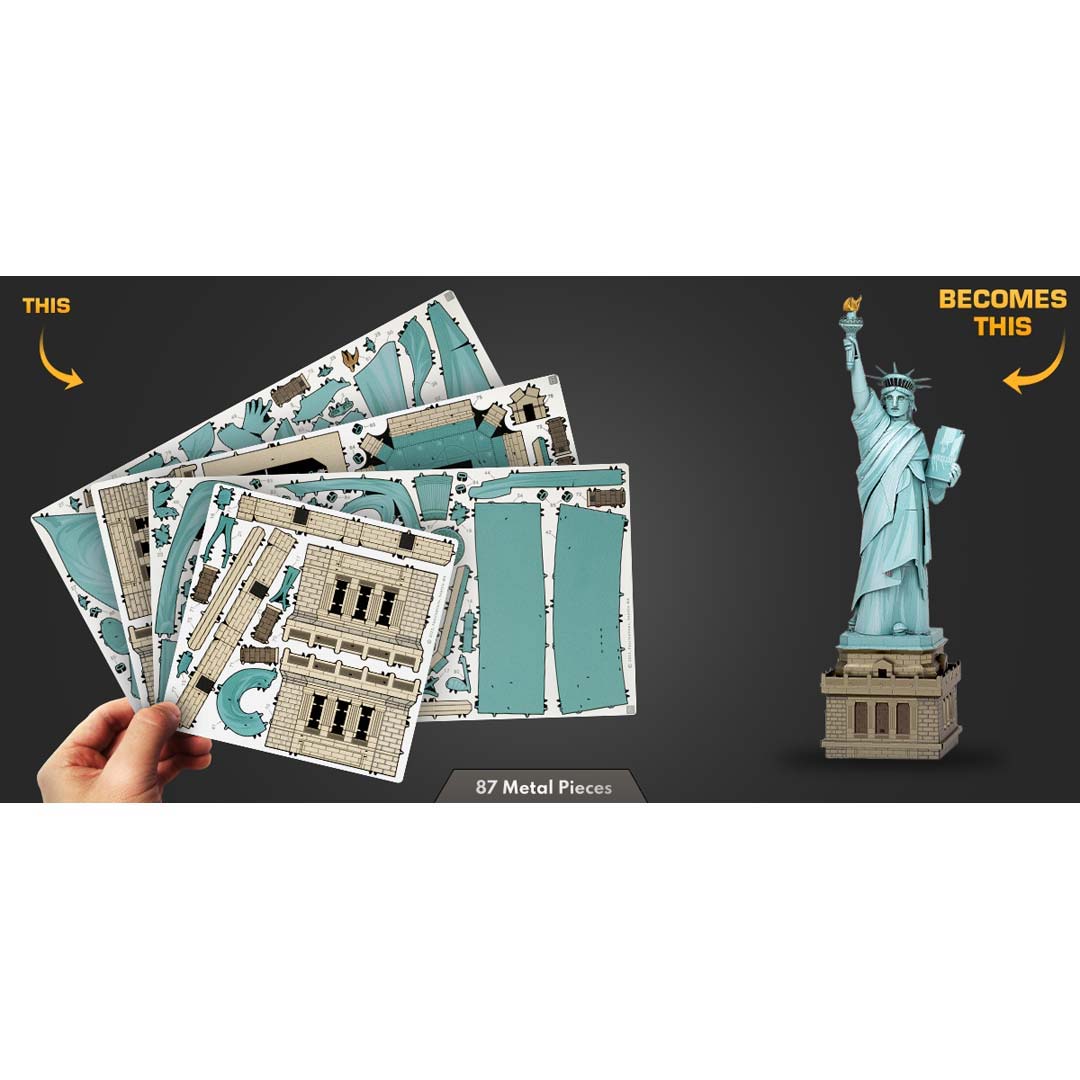 Der Bausatz aus der Premium Series Statue of Liberty (Freiheitsstatue) von Metal Earth besteht aus 3,5 Metallbögen (10 x 20 cm) und ist 5,8 x 5,8 x 24 cm groß.