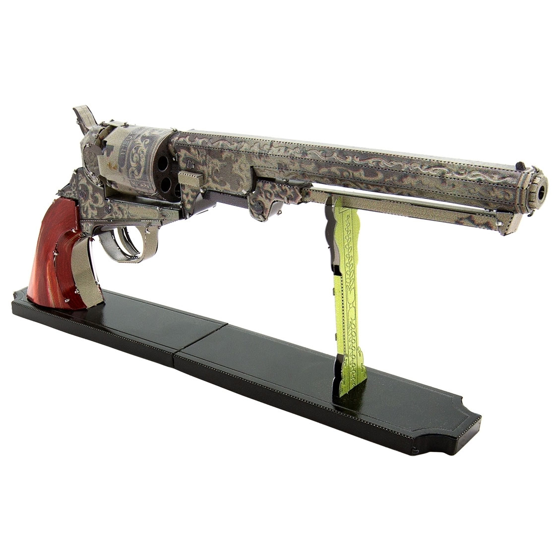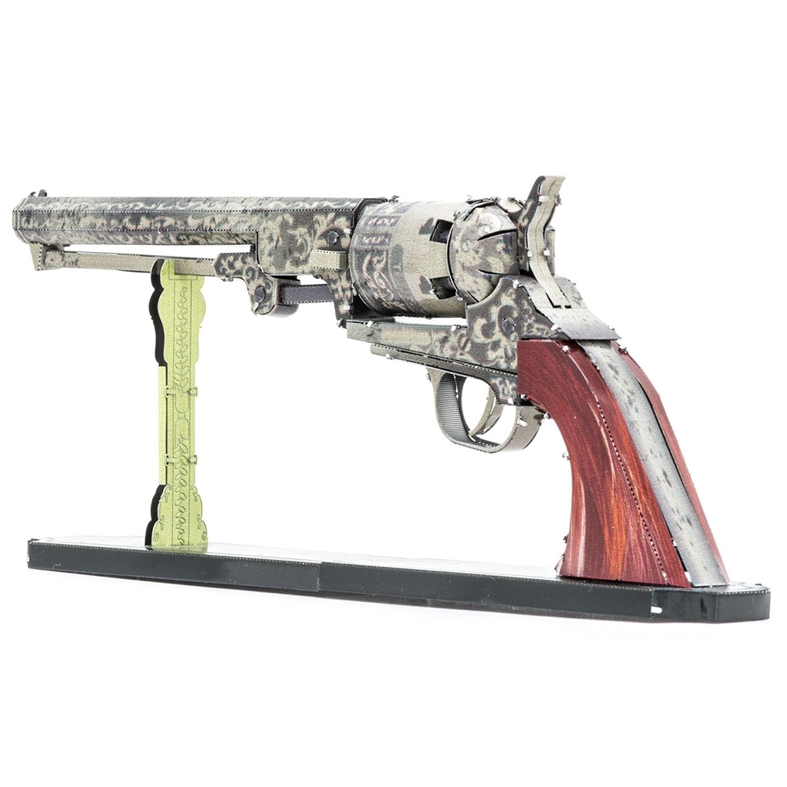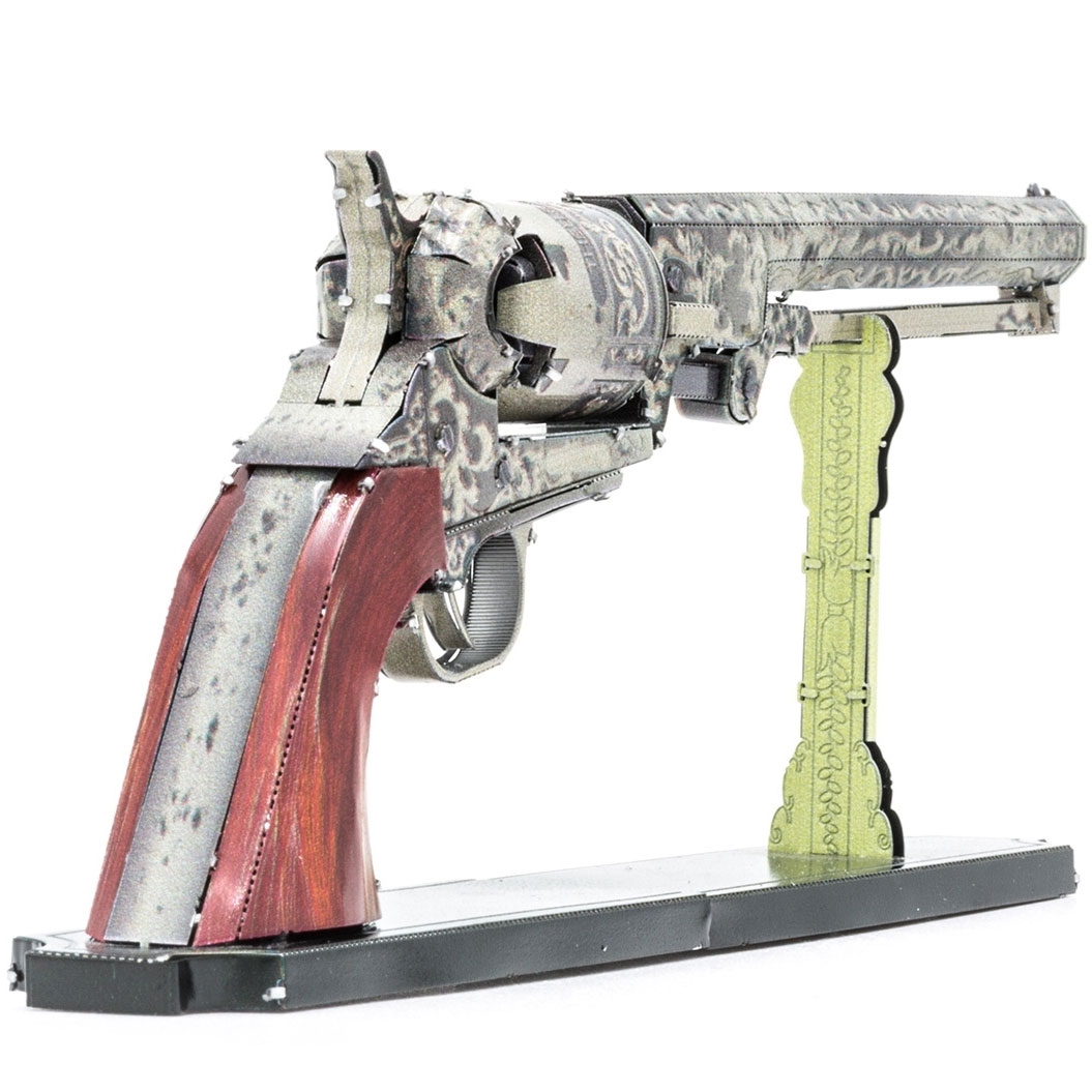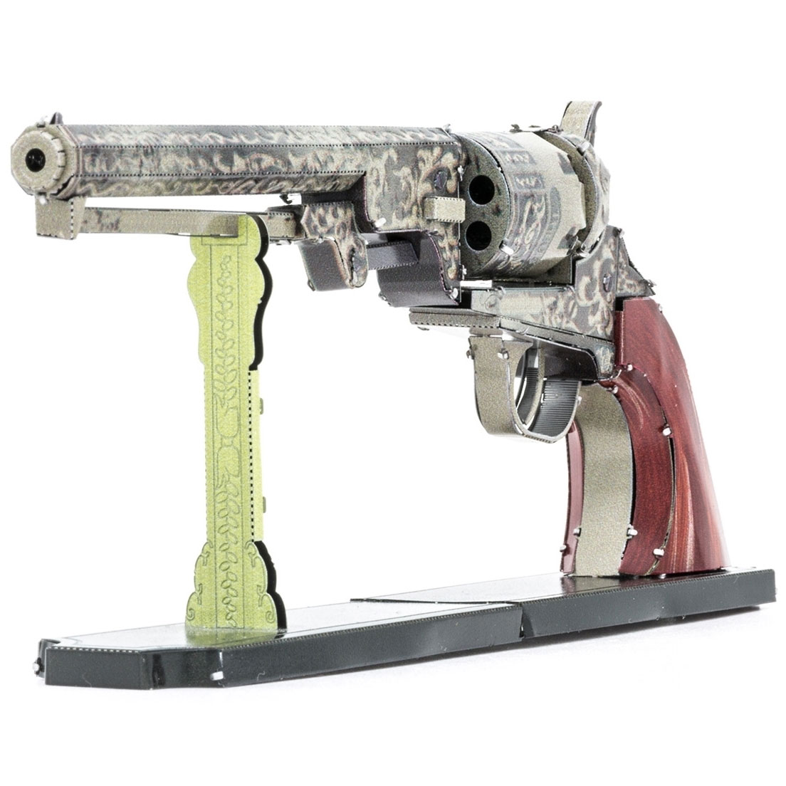 Das Modell Wild West Revolver von Metal Earth besteht aus 2 Metallbögen (11 x 11 cm) und ist 6,2 x 15 x 2,2 cm groß. Kein anderes technisches Gerät hat den Wilden Westen so geprägt wie die Feuerwaffe. Der Revolver gehörte bei den Siedlern und Cowboys zum Alltag wie ein ganz normales Werkzeug. Jeder hatte das Recht eine Waffe zu tragen. Im Wilden Westen war der Revolver ein unentbehrliches Instrument für die Verteidigung gegen Banditen und Räuber.