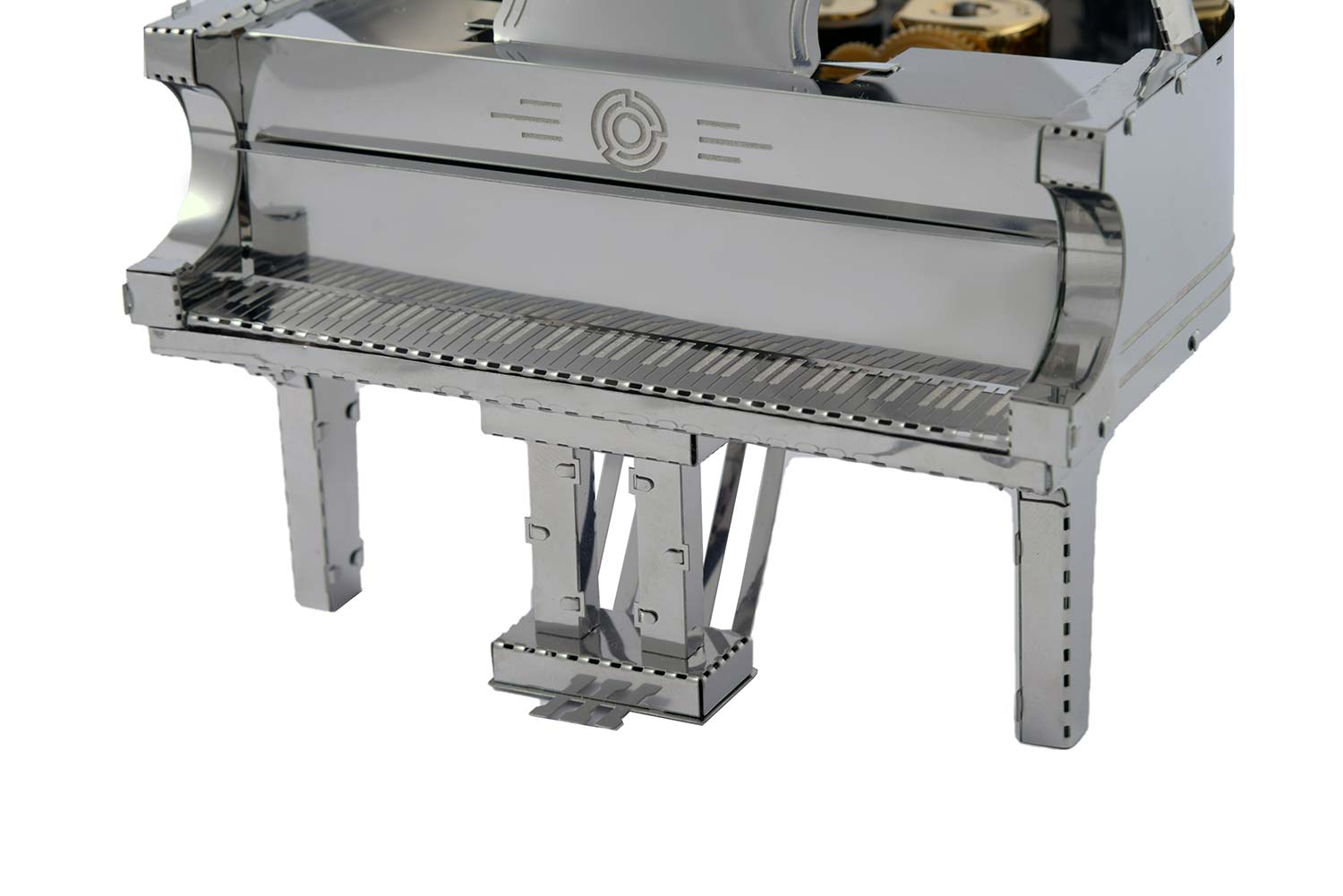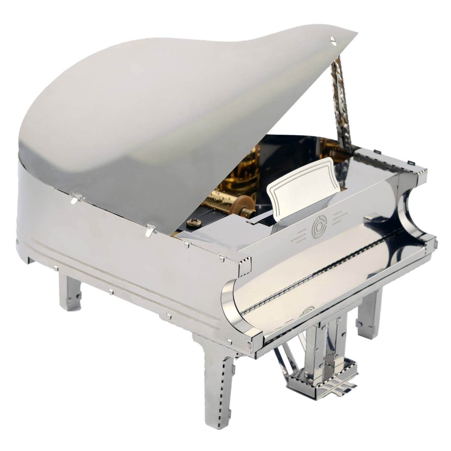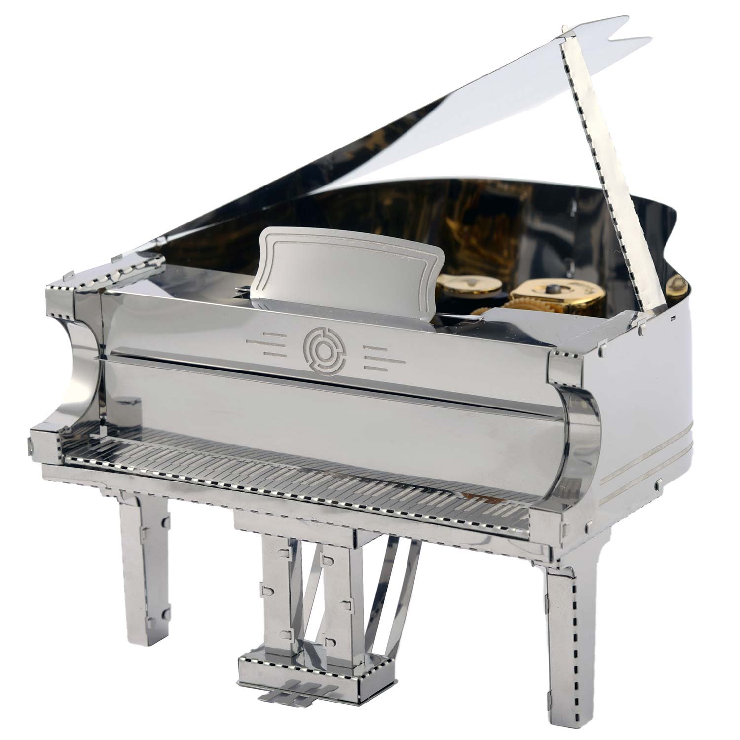 Der Bausatz "Grande Pianola" von Metal Time: Das ästhetische Merkmal des "Grande Pianola" ist die Integration von Metallteilen in verschiedenen Farben. Der Korpus des Klaviers besteht aus stahlfarbenem Material. Die verchromten Tasten verstärken den Realismus des Modells. Das "goldene" Gehäuse des Spielwerks Sankyo Music Box verleiht dem Modell warme Reflexionstöne und das Aussehen eines teuren Accessoires.