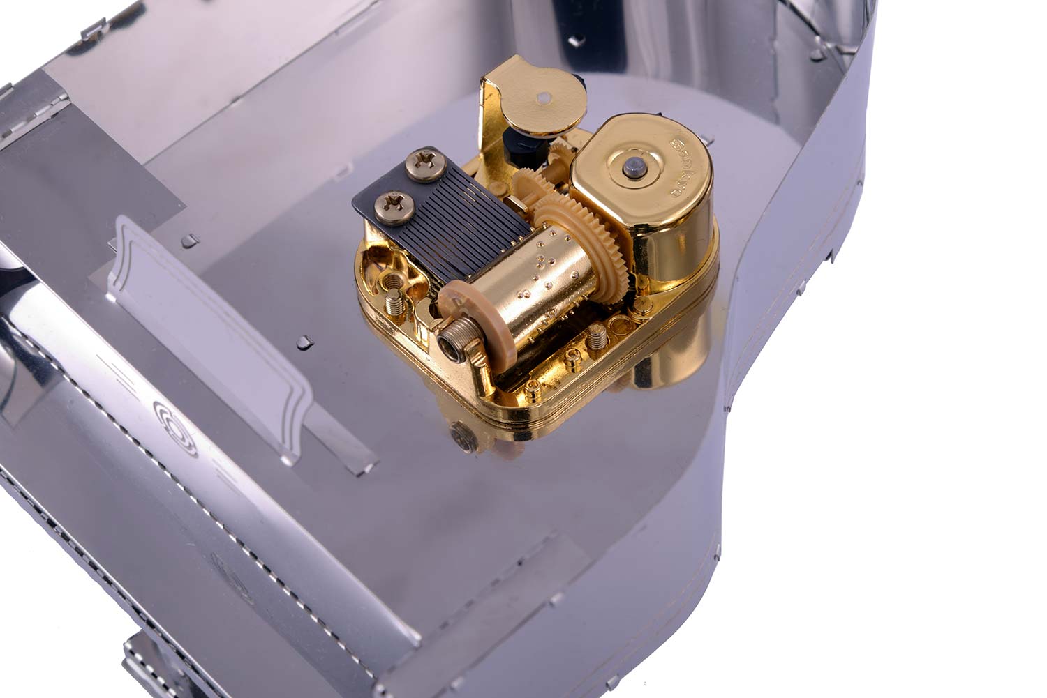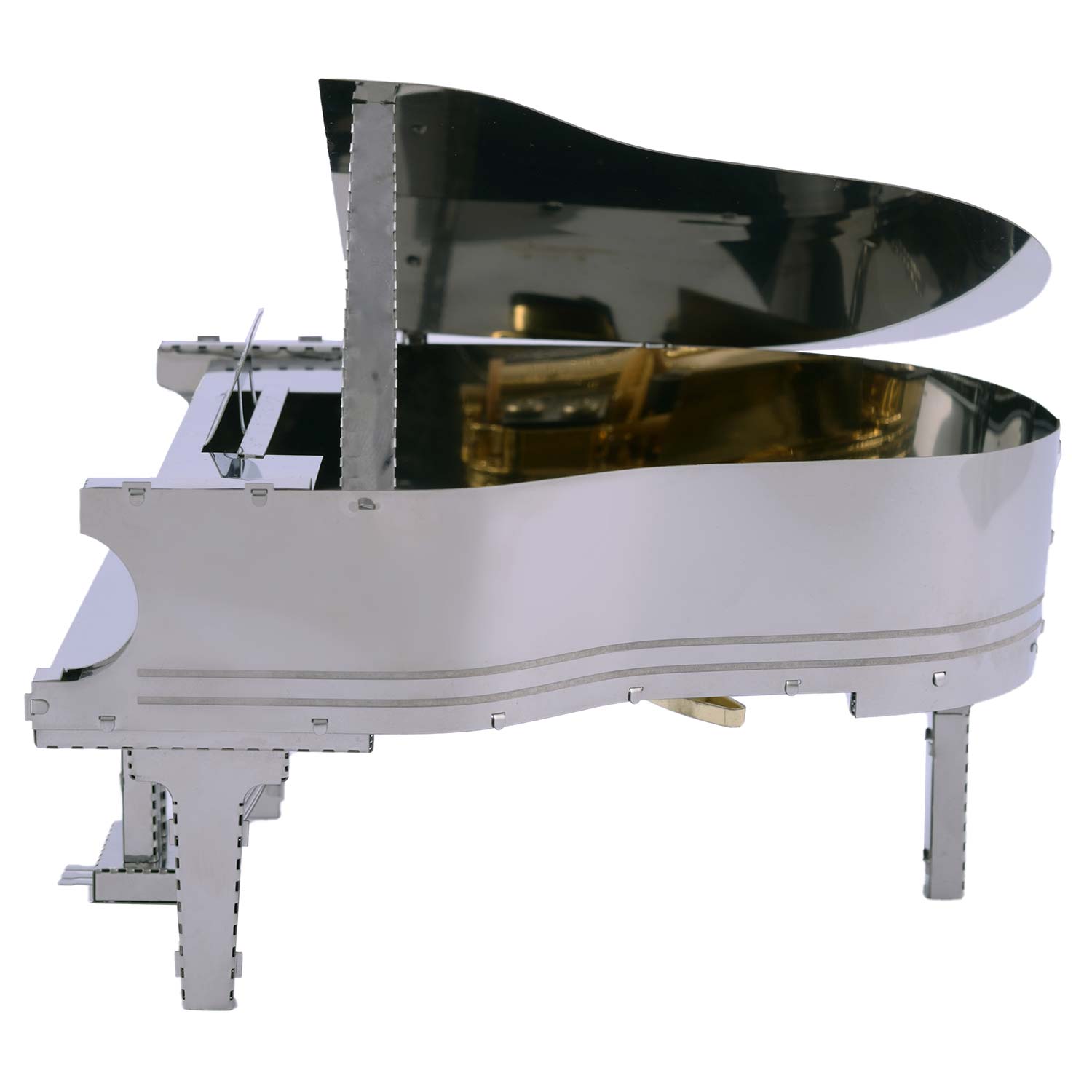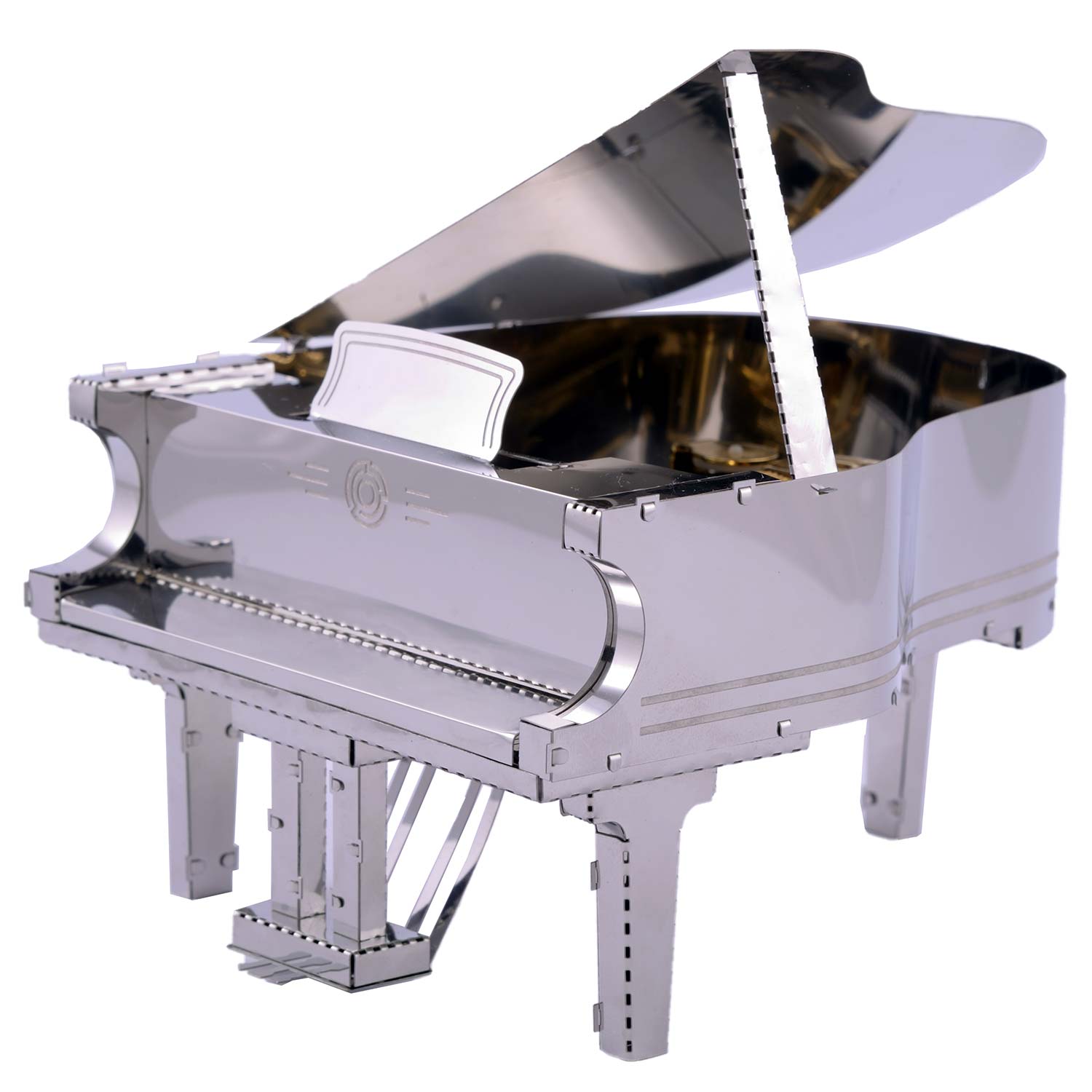Der Bausatz "Grande Pianola" von Metal Time: Das ästhetische Merkmal des "Grande Pianola" ist die Integration von Metallteilen in verschiedenen Farben. Der Korpus des Klaviers besteht aus stahlfarbenem Material. Die verchromten Tasten verstärken den Realismus des Modells. Das "goldene" Gehäuse des Spielwerks Sankyo Music Box verleiht dem Modell warme Reflexionstöne und das Aussehen eines teuren Accessoires.