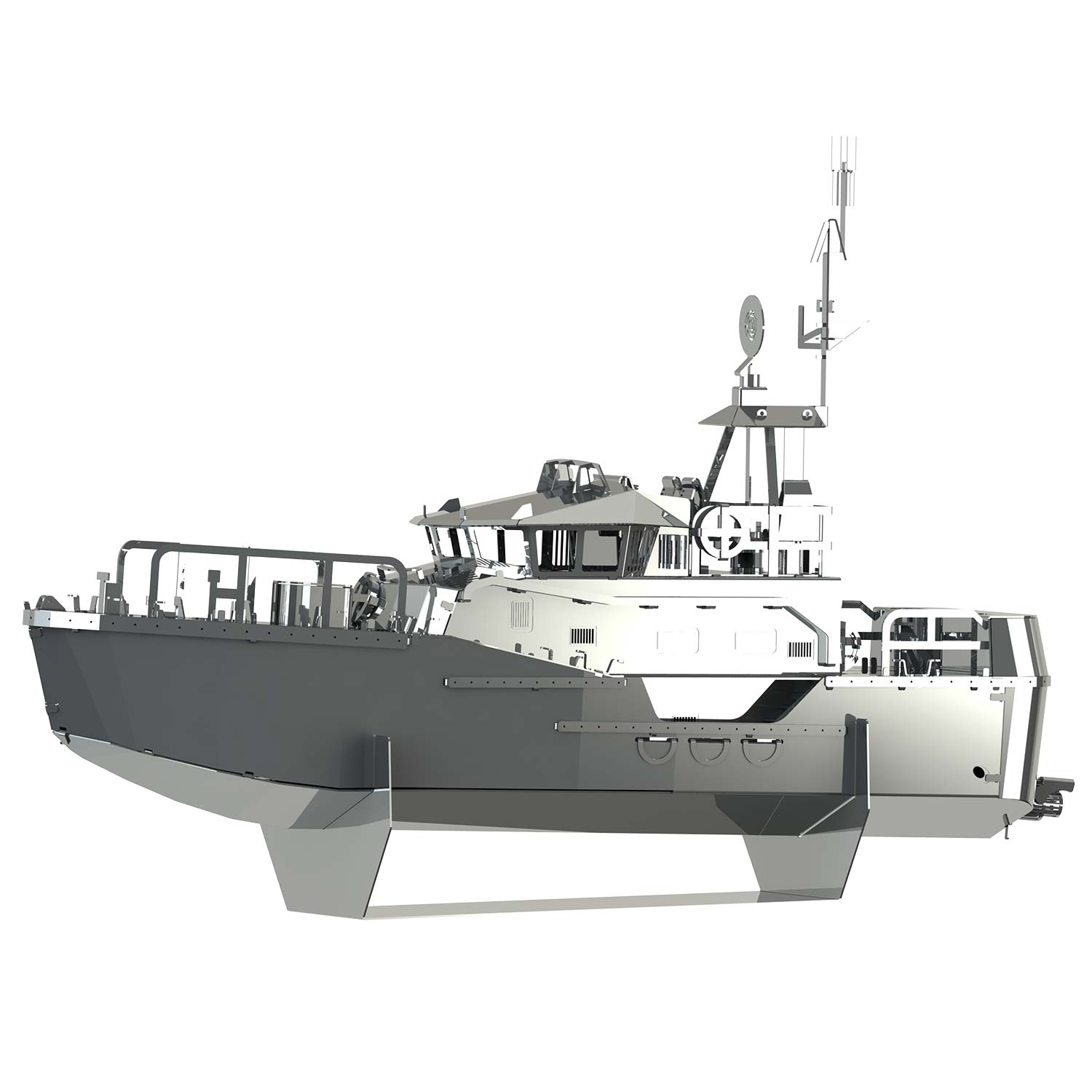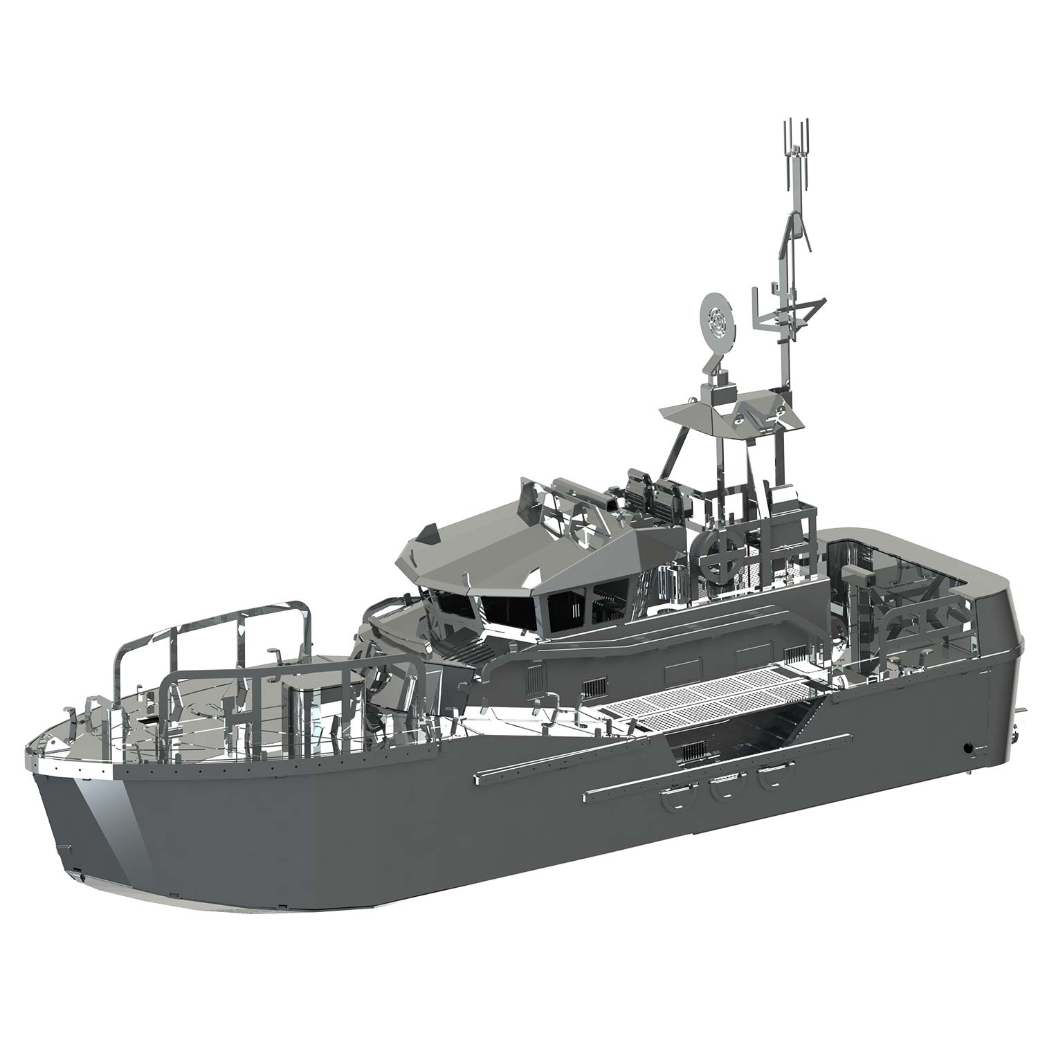 Der Bausatz "Guardian of the Coasts" von Metal Time wird von einem Elektromotor angetrieben, der das Radargerät des Schiffes antreibt. Der Schiffsrumpf wird von der Demonstrationsplattform getragen. Dank ihr kann das Modell auf jeder horizontalen Fläche als Innendekoration, als Exponat einer Sammlung oder als Element einer Anlage aufgestellt werden.