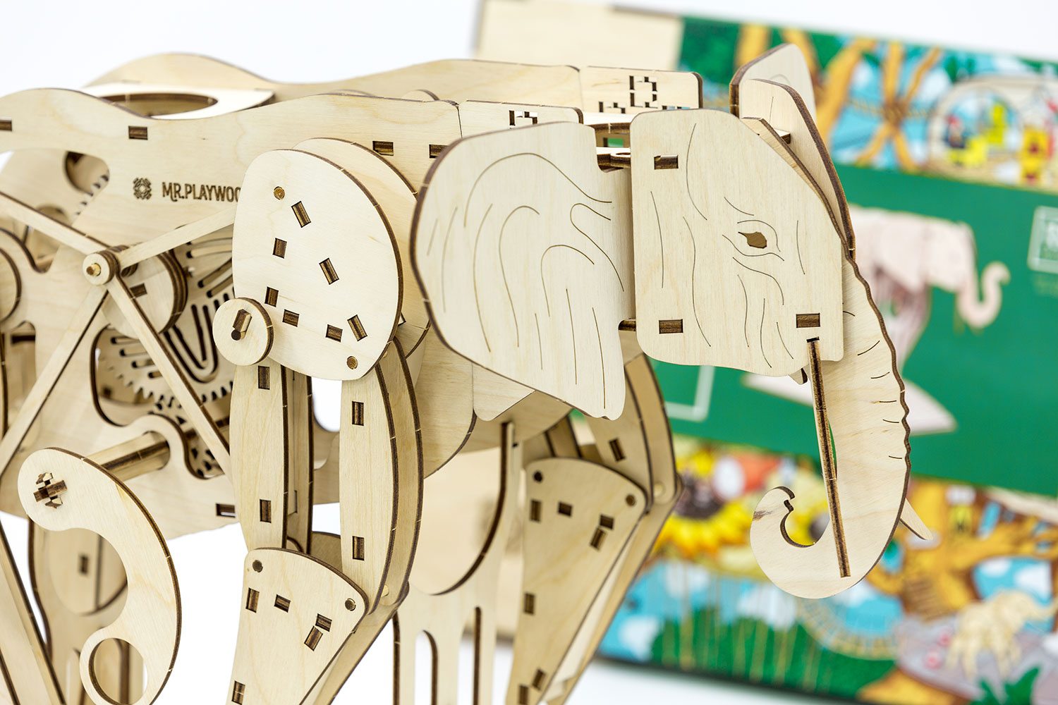 Der Elefant von Mr. Playwood bewegt sich durch einen viergliedrigen Mechanismus voran. Der mit Zahnrädern realisierte Mechanismus bewegt alle vier Beine gleichzeitig. Die Ohren sind beweglich - der Elefant wackelt mit den Ohren, wenn er glücklich ist.