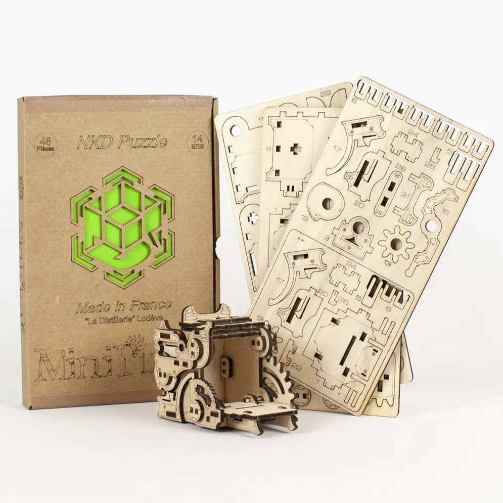 Das mechanische MiniPunk-Puzzle wurde in einer Werkstatt in Südfrankreich in Lodève in Okzitanien entworfen und hergestellt. Dies ist ein ethisches Modell, da das verwendete Pappelholz aus nachhaltig bewirtschafteten Wäldern stammt. Jedes der 48 Teile, aus denen dieser Holzwürfel besteht, wurde lasergeschnitten.