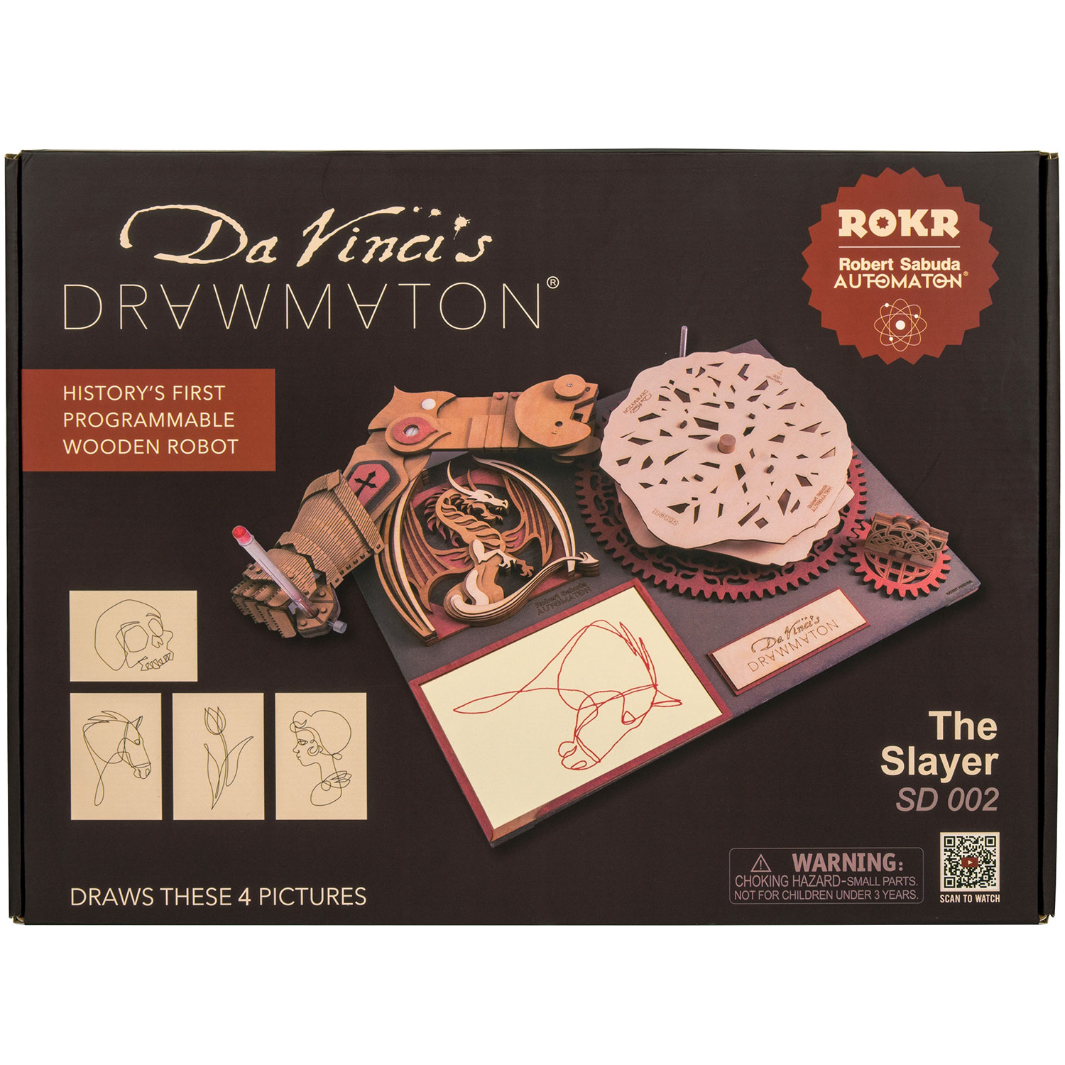Leonardo da Vinci liebte Roboter und baute sie, um Freunde, aber auch Könige und Königinnen zu unterhalten. Da Vinci's Drawmaton basiert auf Leonardos mechanischem Ritter, den er ca. 1495 baute und der erste Roboter der Geschichte sein könnte. Neben Funktionen wie Handschütteln, Trommeln und Umarmen soll der mechanische Ritter aber auch eine spezielle Fähigkeit gehabt haben, er soll Bilder gezeichnet haben können. Der Bausatz läßt solch eine Zeichenmaschine entstehen. Beigelegt sind "Programmierscheiben" für vier verschiedene Bilder, die vom Arm der Maschine durch Drehen der Scheiben gezeichnet werden.
