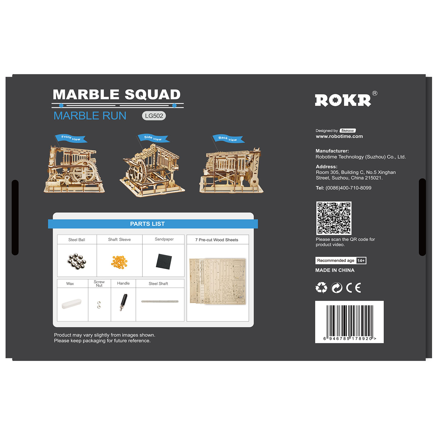 Rokr ist eine Marke des chinesischen Herstellers Robotime. Die mechanischen Holz-Bausätze von Rokr bestehen aber nicht komplett aus Holz, sondern setzen auch wenige Teile aus Metall und Kunststoff ein, um die mechanischen Funktionen robuster und lauffähiger zu gestalten.