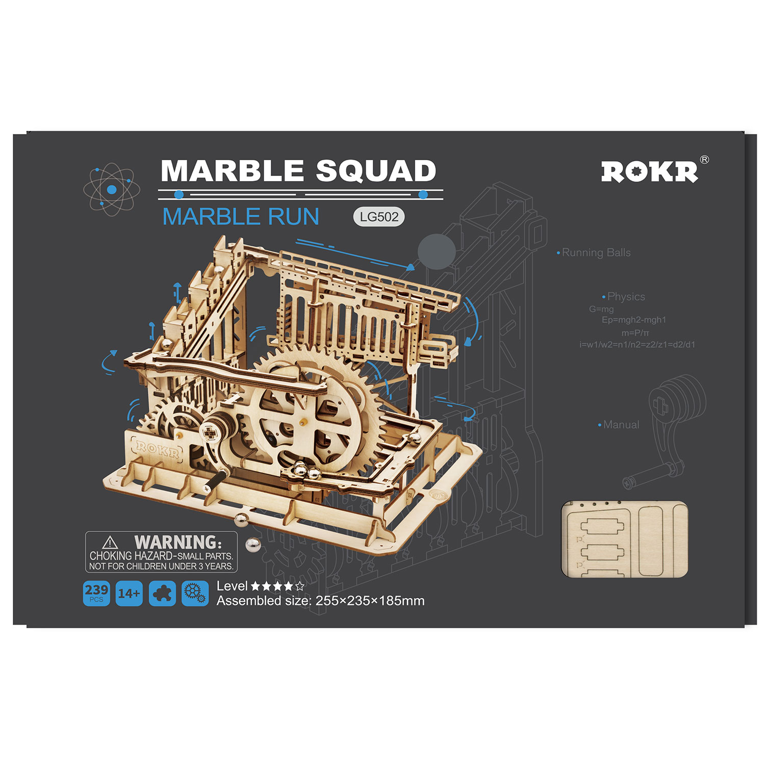 Der Bausatz Marble Squad von Rokr ist eine Murmelbahn mit mechanischen Funktionen. Lassen Sie die M;urmel durch das Modell rollen und schauen Sie zu, wie die mechanischen Elemente die Kugel antreiben.