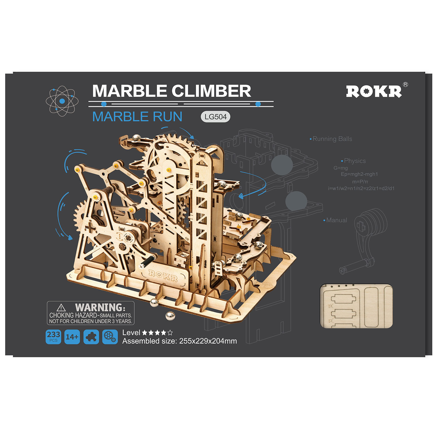 Der Bausatz Marble Climber von Rokr ist eine Murmelbahn mit mechanischen Funktionen. Lassen Sie die M;urmel durch das Modell rollen und schauen Sie zu, wie die mechanischen Elemente die Kugel antreiben.