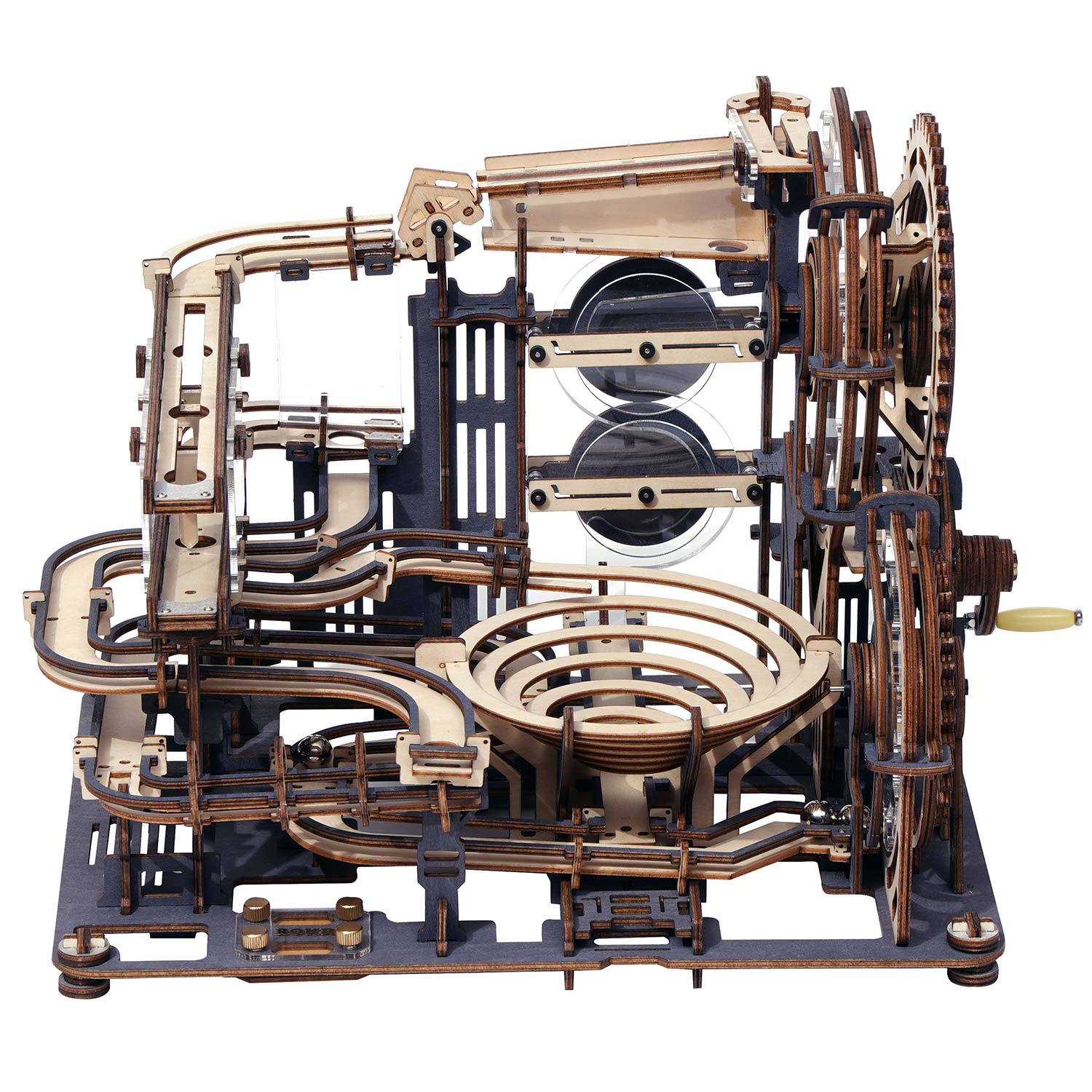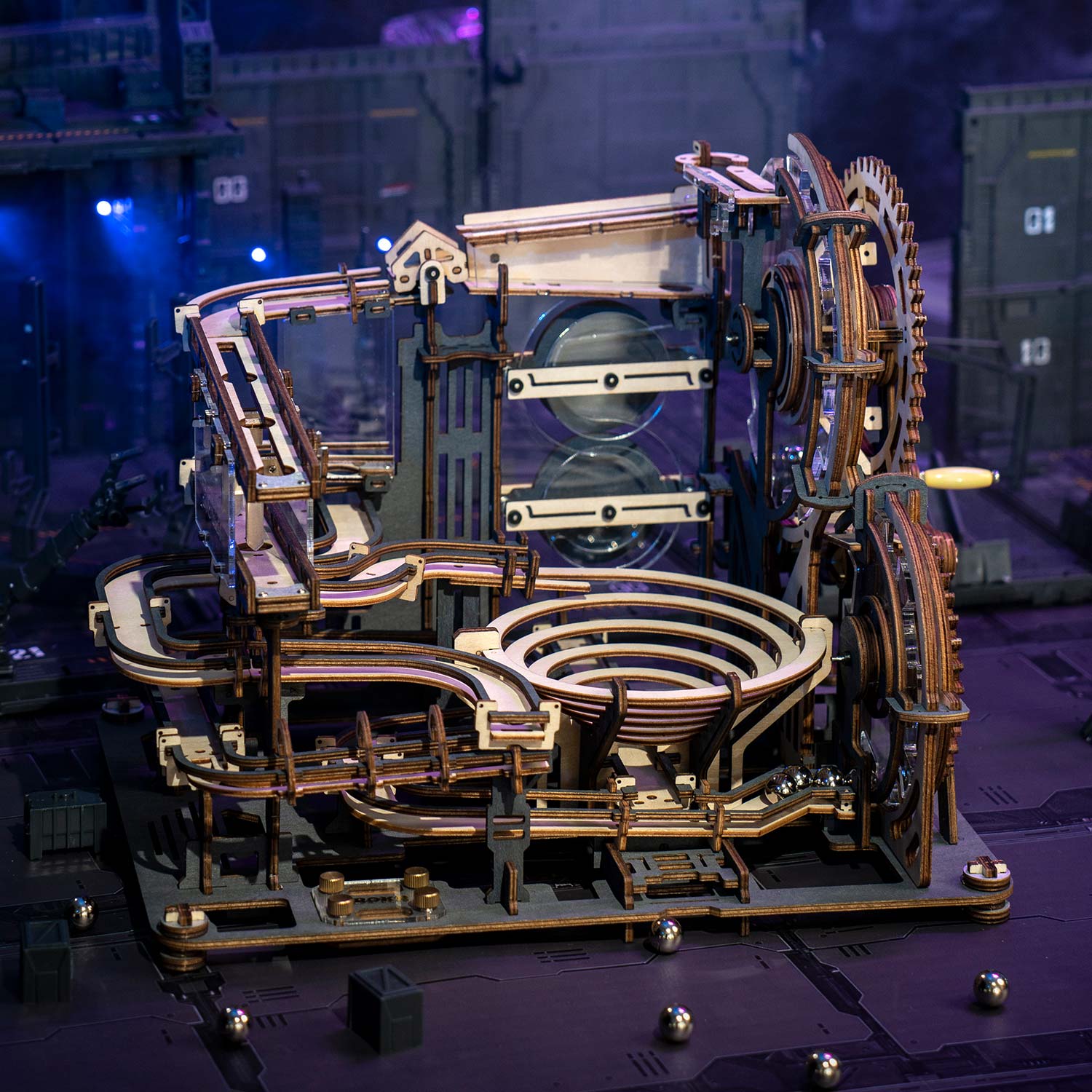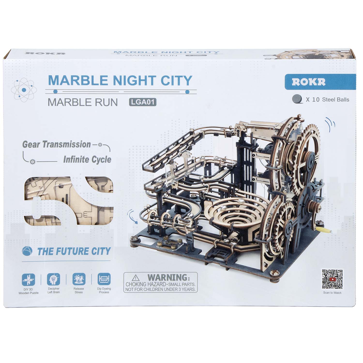 Der Bausatz Marble Night City von Rokr ist eine Murmelbahn mit mechanischen Funktionen. Lassen Sie die M;urmel durch das Modell rollen und schauen Sie zu, wie die mechanischen Elemente die Kugel antreiben.