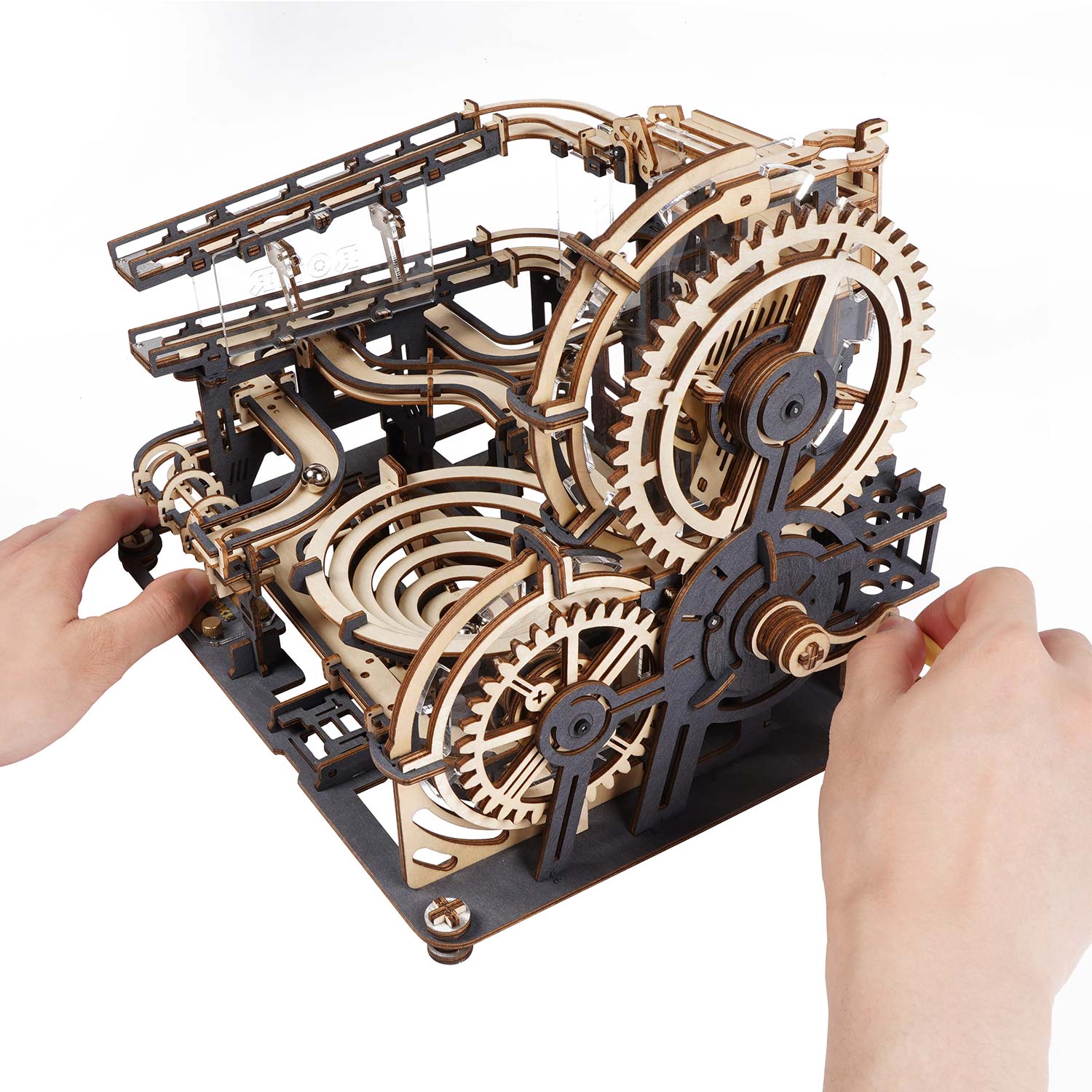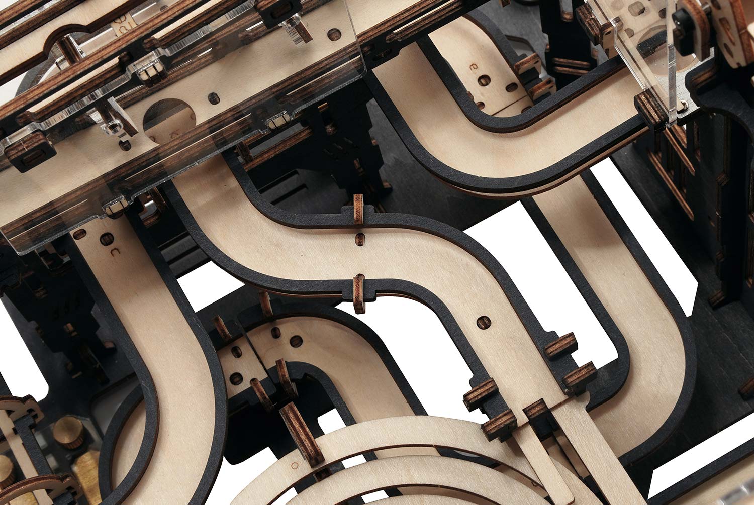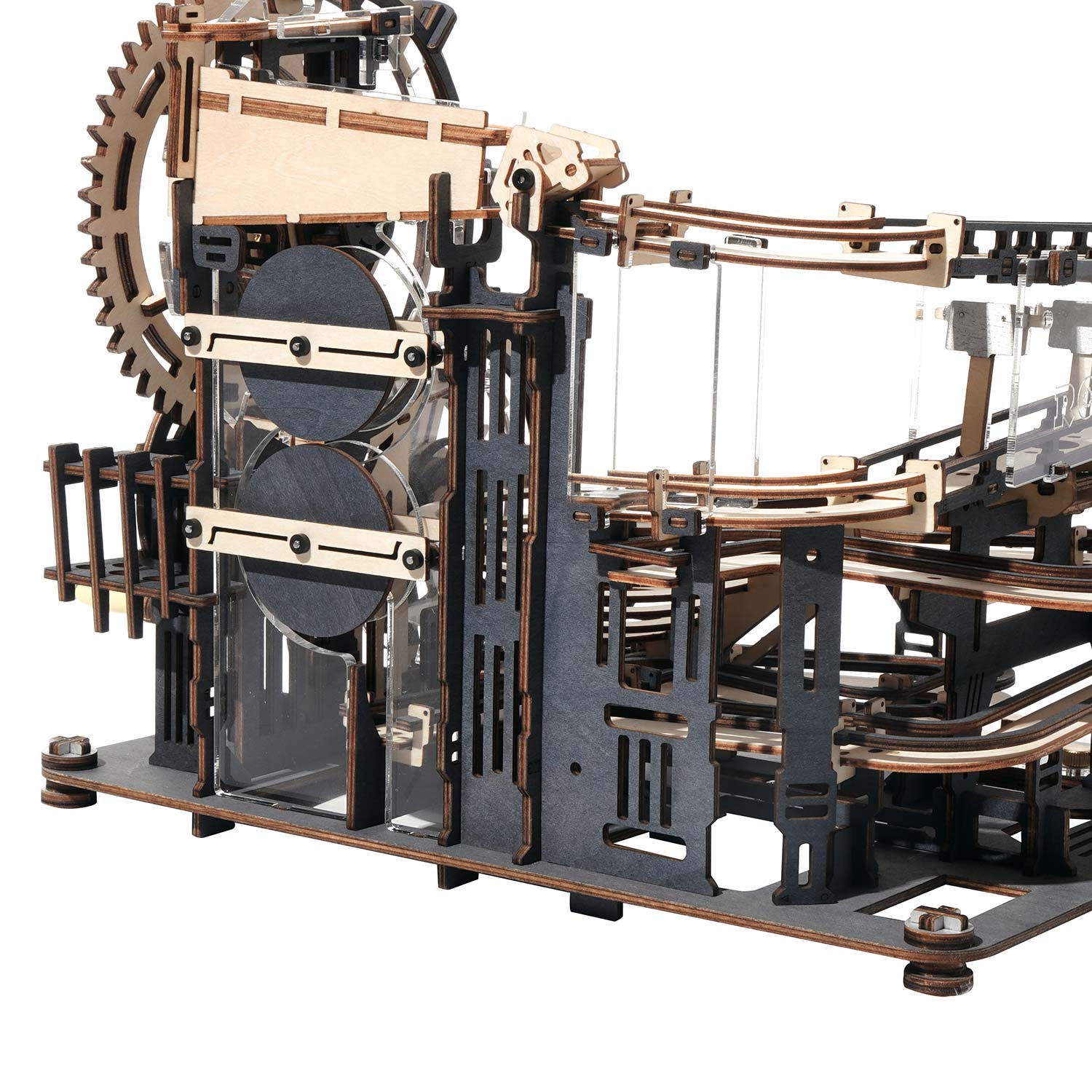 Der Bausatz Marble Night City von Rokr ist eine Murmelbahn mit mechanischen Funktionen. Lassen Sie die M;urmel durch das Modell rollen und schauen Sie zu, wie die mechanischen Elemente die Kugel antreiben.