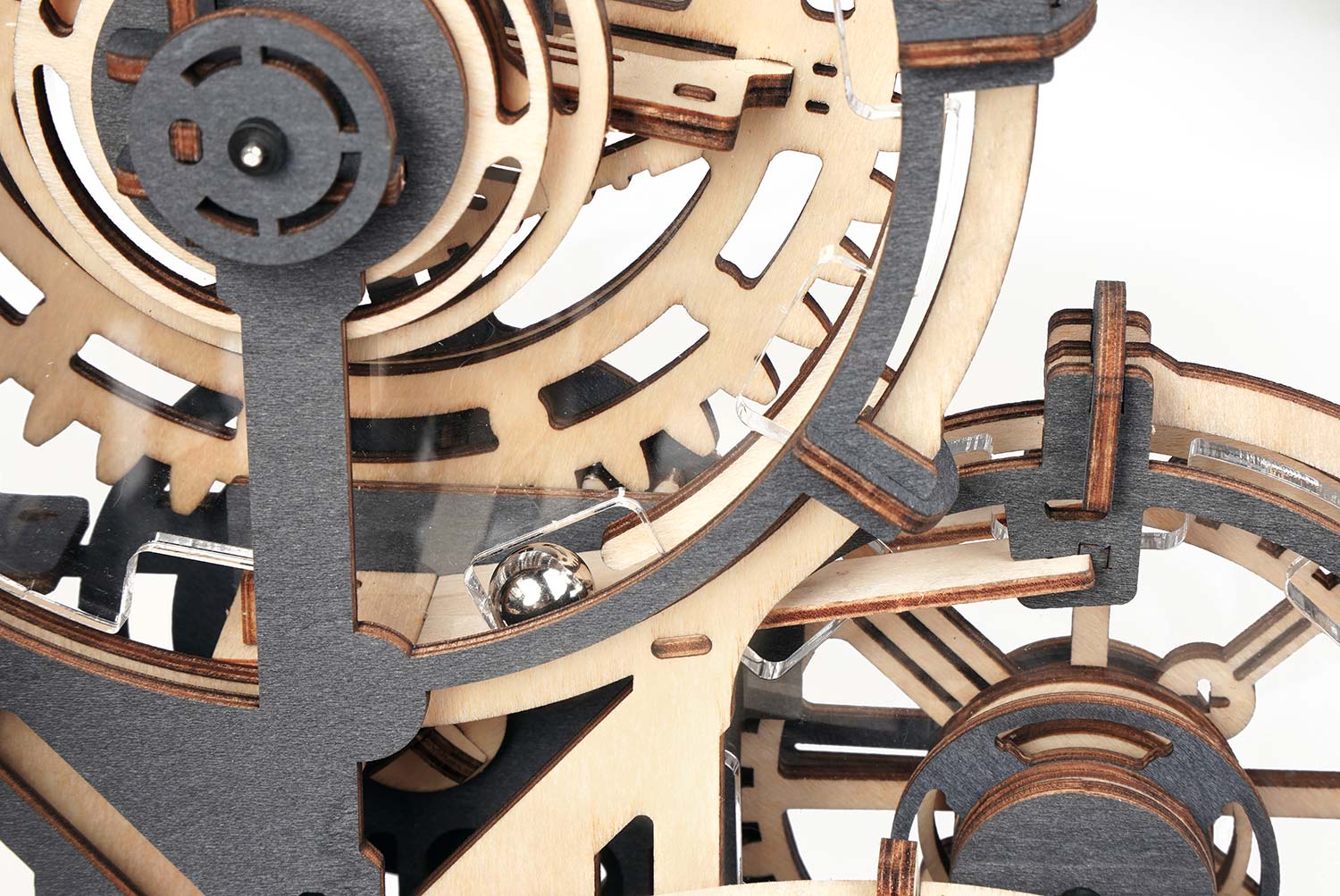 Rokr ist eine Marke des chinesischen Herstellers Robotime. Die mechanischen Holz-Bausätze von Rokr bestehen aber nicht komplett aus Holz, sondern setzen auch wenige Teile aus Metall und Kunststoff ein, um die mechanischen Funktionen robuster und lauffähiger zu gestalten.