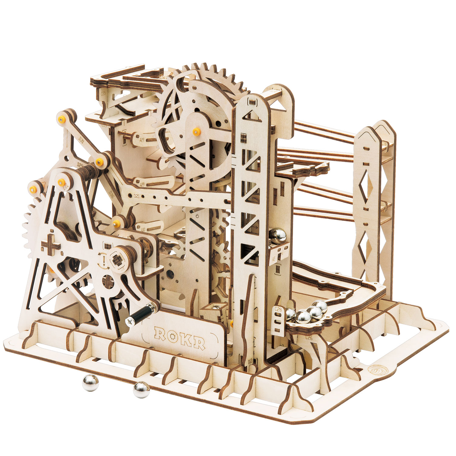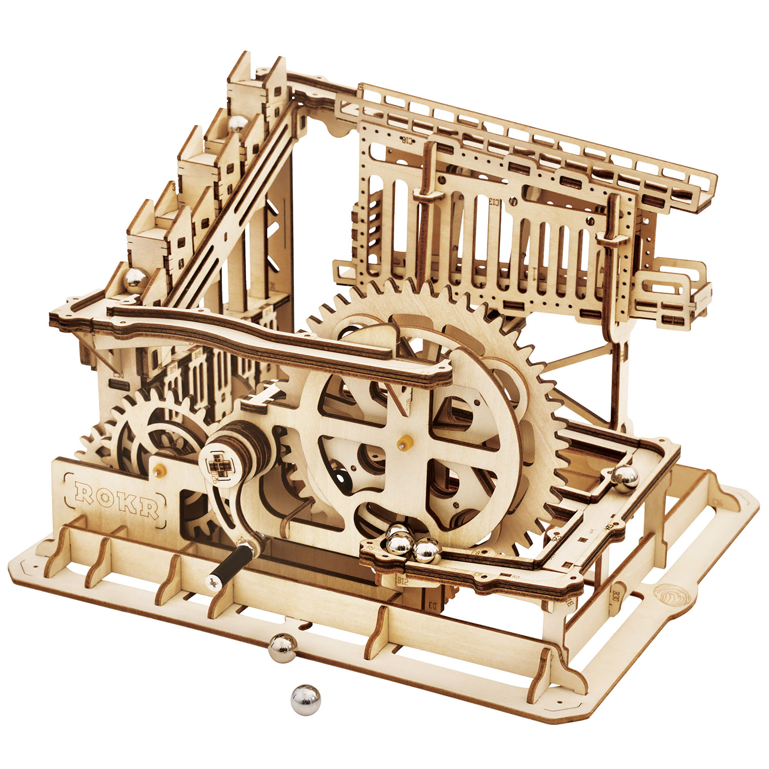 Die Marble-Bausätze von Rokr sind Murmelbahnen mit mechanischen Funktionen. Lassen Sie die M;urmel durch das Modell rollen und schauen Sie zu, wie die mechanischen Elemente die Kugel antreiben.