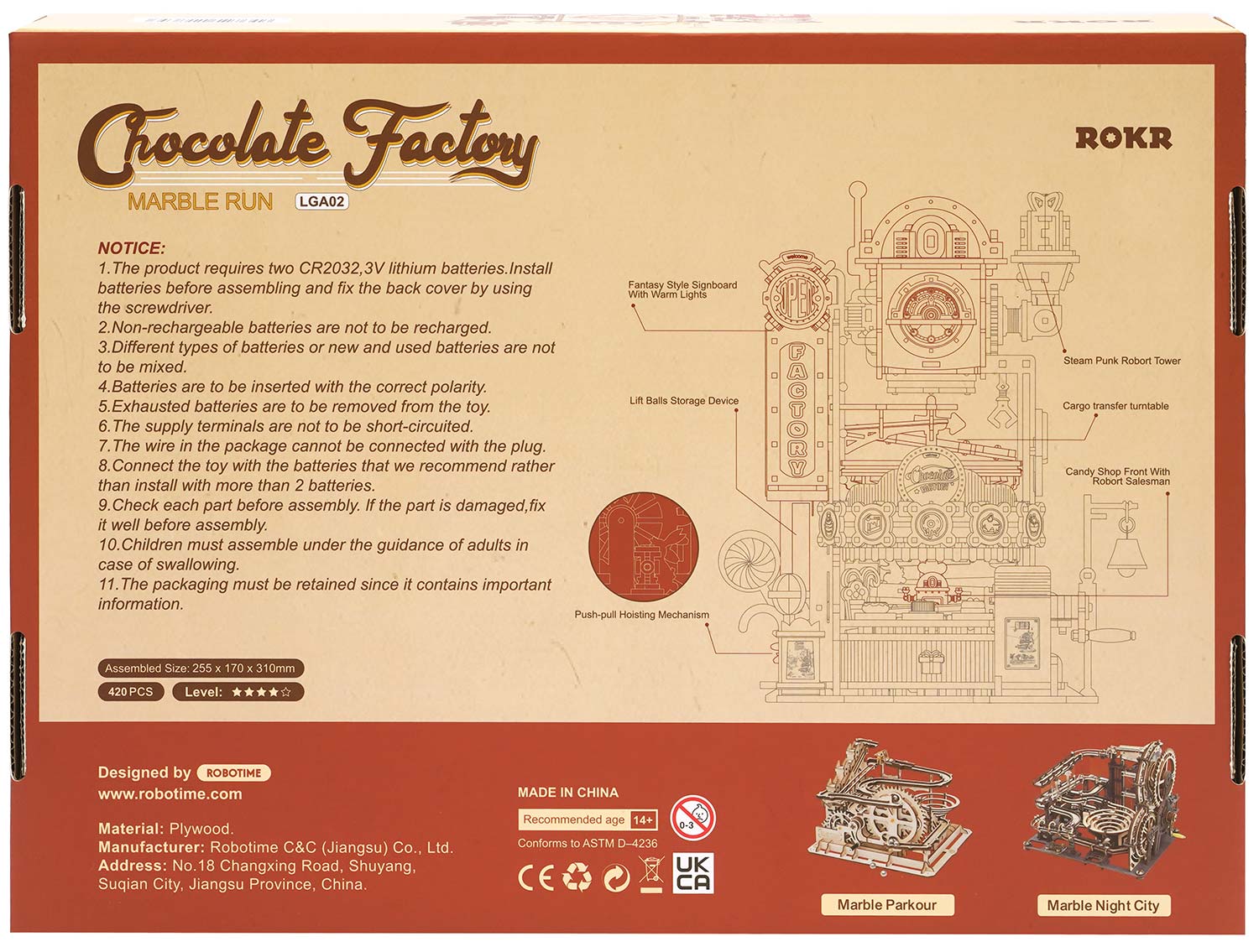 Rokr ist eine Marke des chinesischen Herstellers Robotime. Die mechanischen Holz-Bausätze von Rokr bestehen aber nicht komplett aus Holz, sondern setzen auch wenige Teile aus Metall und Kunststoff ein, um die mechanischen Funktionen robuster und lauffähiger zu gestalten.