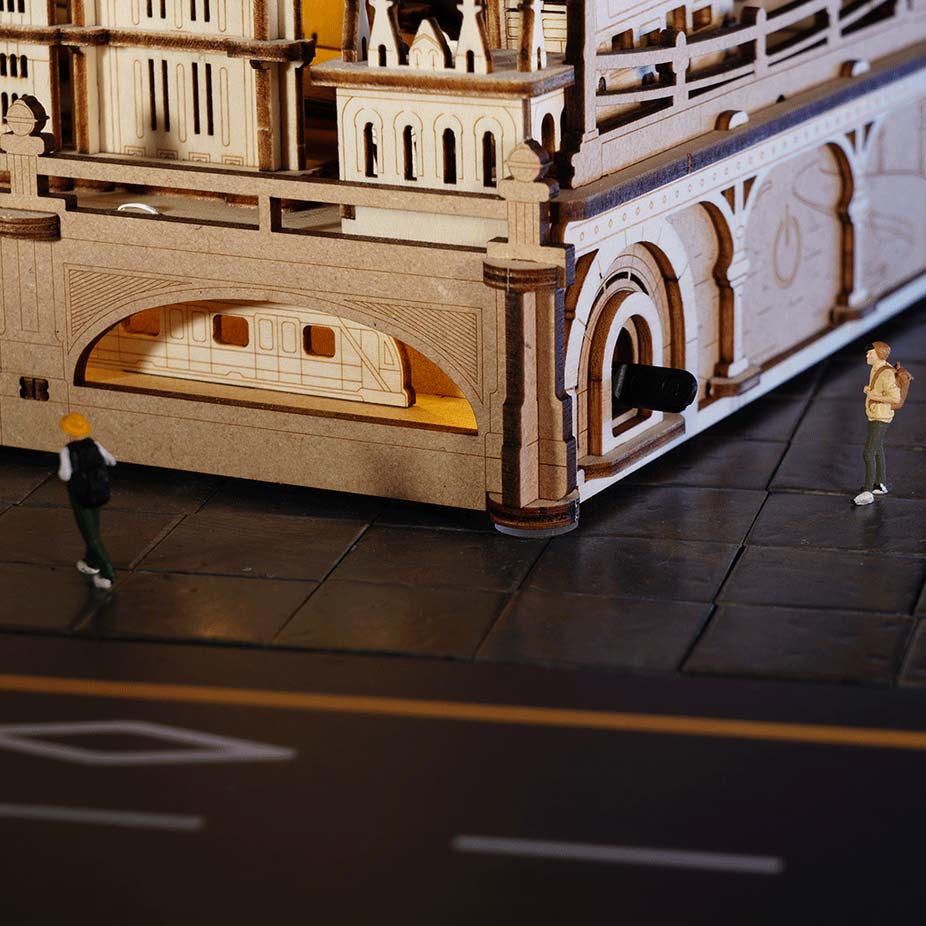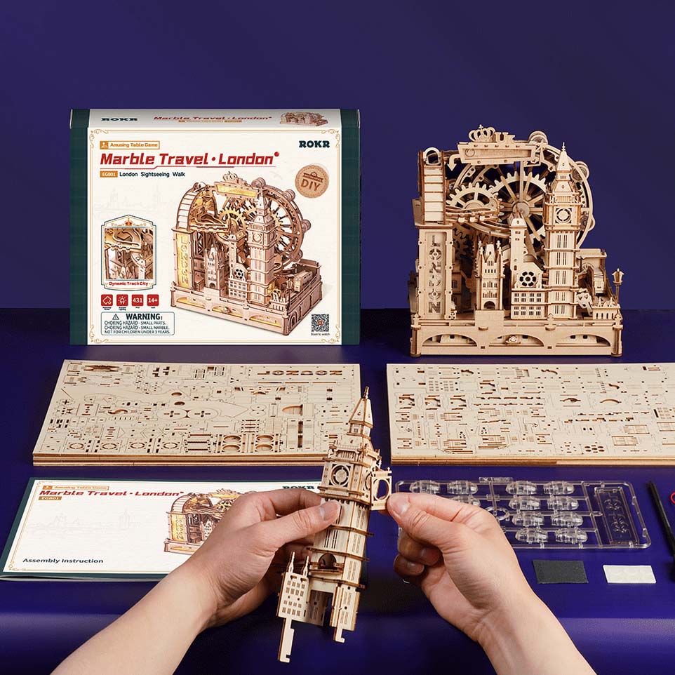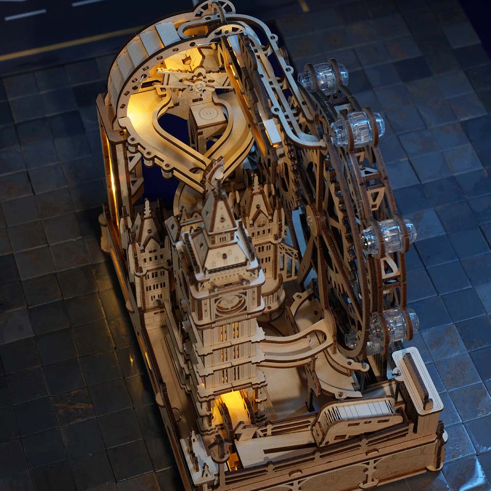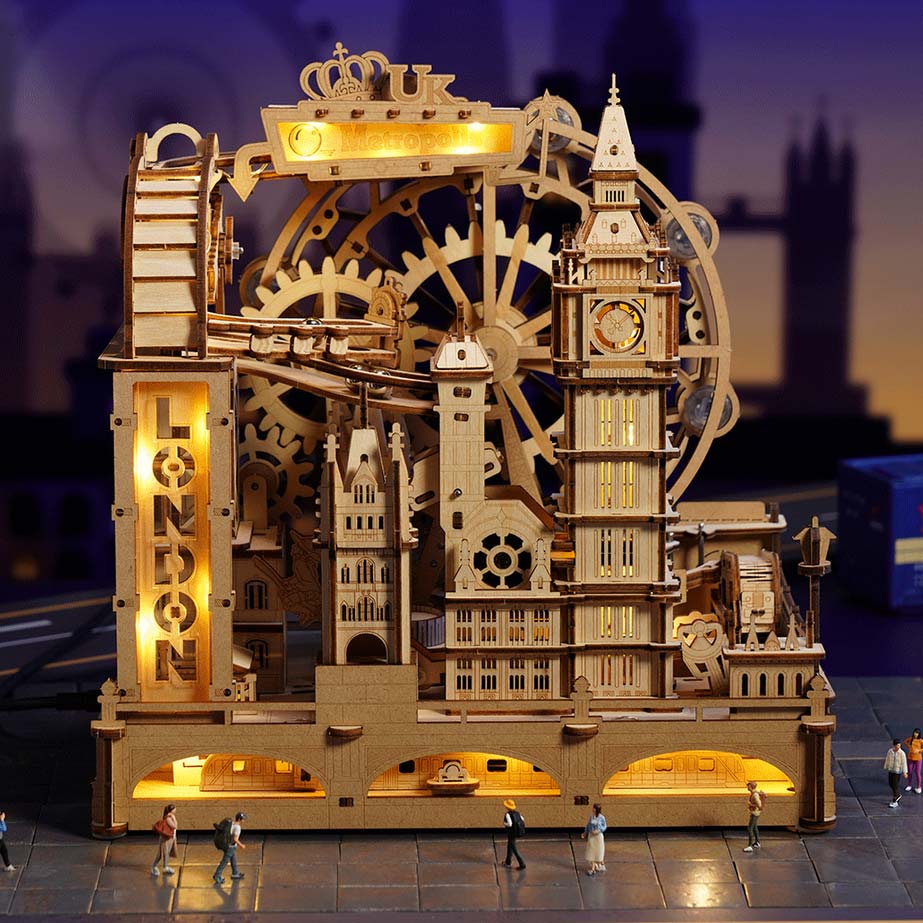 Bereiten Sie sich auf eine atemberaubende Tour durch die britische Hauptstadt vor, ohne Ihr Zimmer zu verlassen mit diesem mechanischen Wunderwerk, das als interaktives 3D-Holzpuzzle getarnt ist. Dank präziser Ingenieurskunst und Miniaturversionen von Big Ben, Tower Bridge und London Eye können Sie die Sehenswürdigkeiten hautnah erleben. Überqueren Sie die Themse und steigen Sie in den Doppeldeckerbus oder die U-Bahn, um im Handumdrehen Ihr Ziel zu erreichen, während Metallkugeln mithilfe der Schwerkraft und eines robusten Motors durch Rampen und Tunnel sausen.