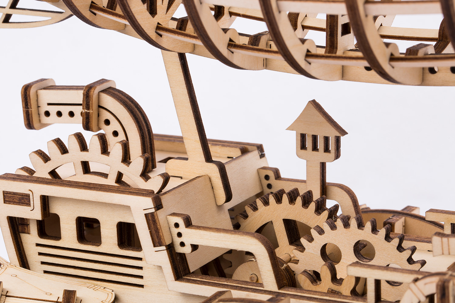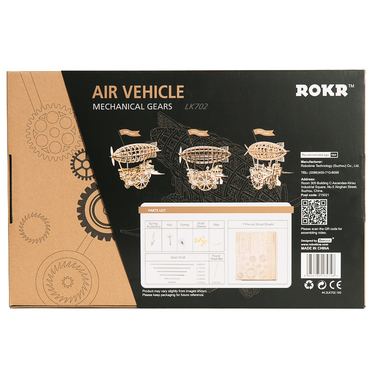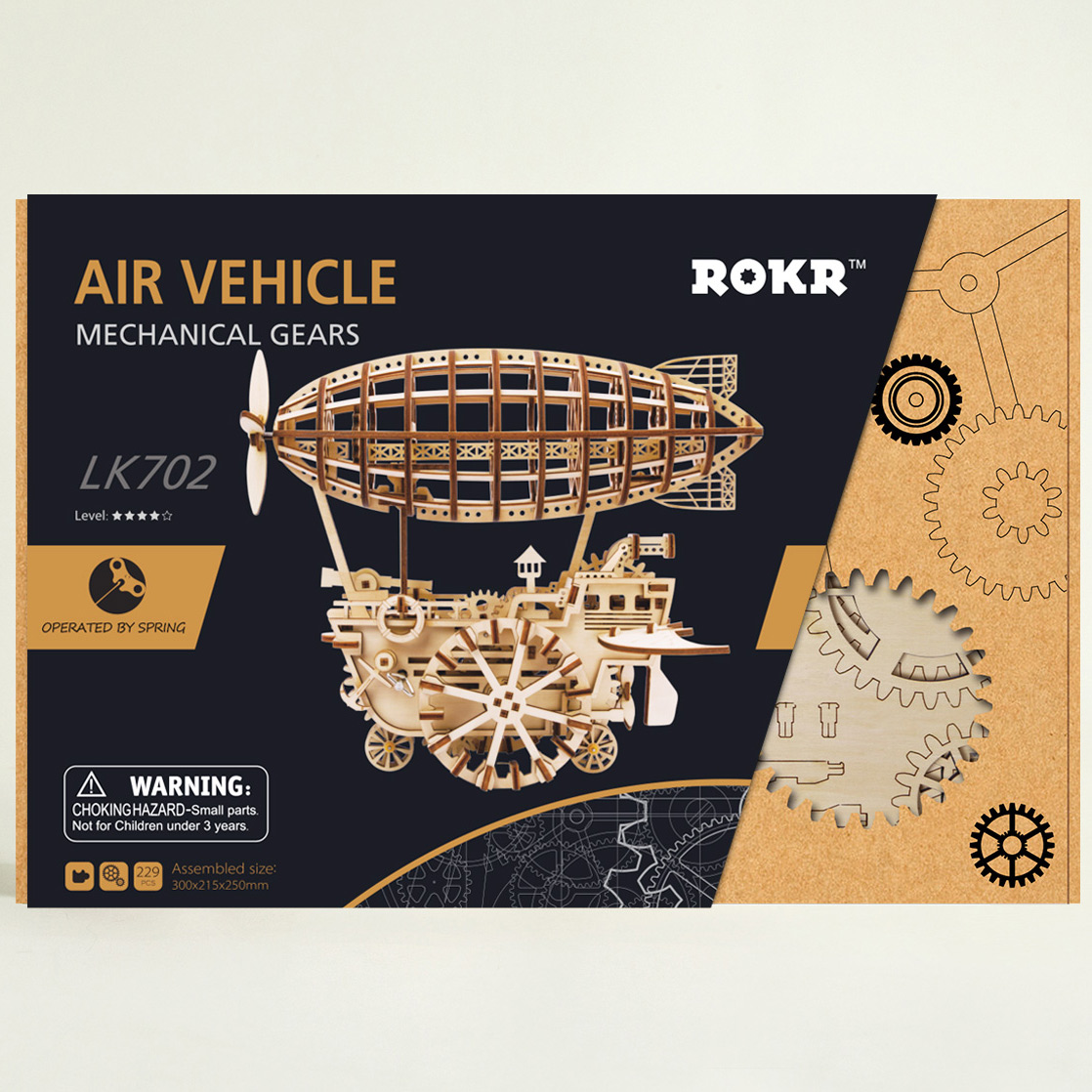 Rokr ist eine Marke des chinesischen Herstellers Robotime. Die mechanischen Holz-Bausätze von Rokr bestehen aber nicht komplett aus Holz, sondern setzen auch wenige Teile aus Metall und Kunststoff ein, um die mechanischen Funktionen robuster und lauffähiger zu gestalten.