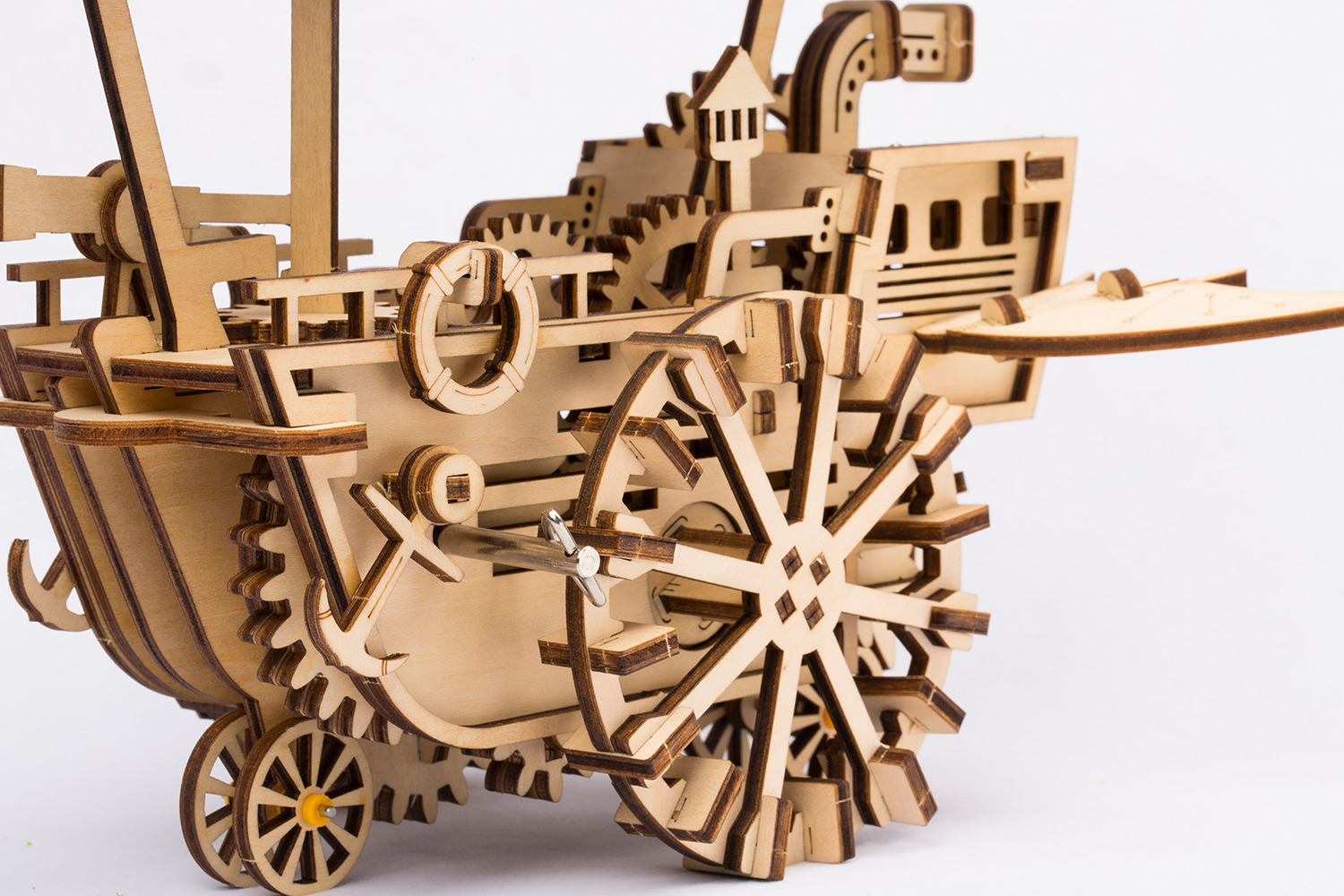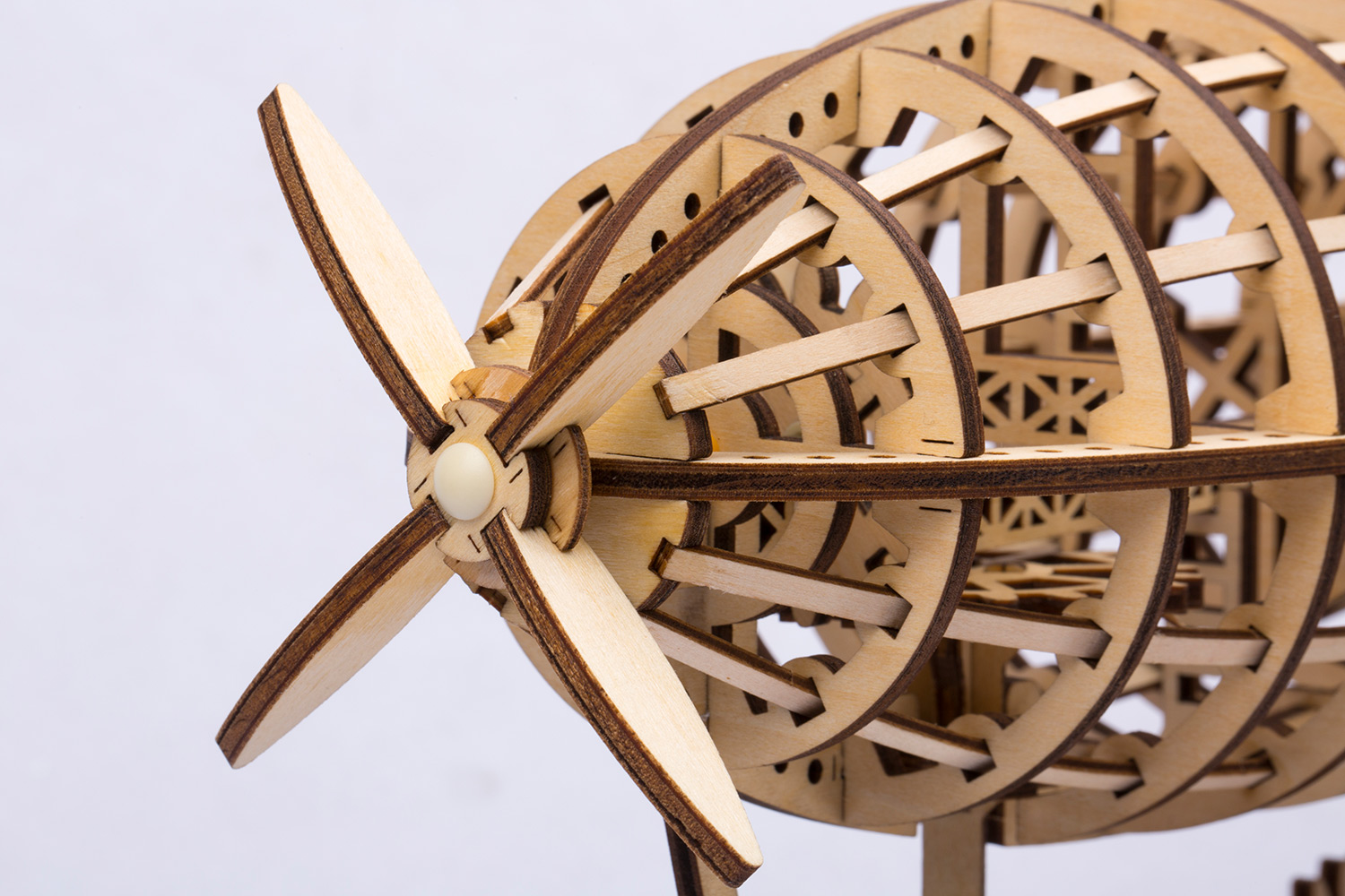 Das Air Vehicle von Rokr ist ein toller Holz-Bausatz. Über viele Zahnräder treibt die Aufziehfeder als Motor das Modell an und läßt unter anderem die Räder und den Propeller drehen. Dadurch kann sich das Modell von alleine fortbewegen.