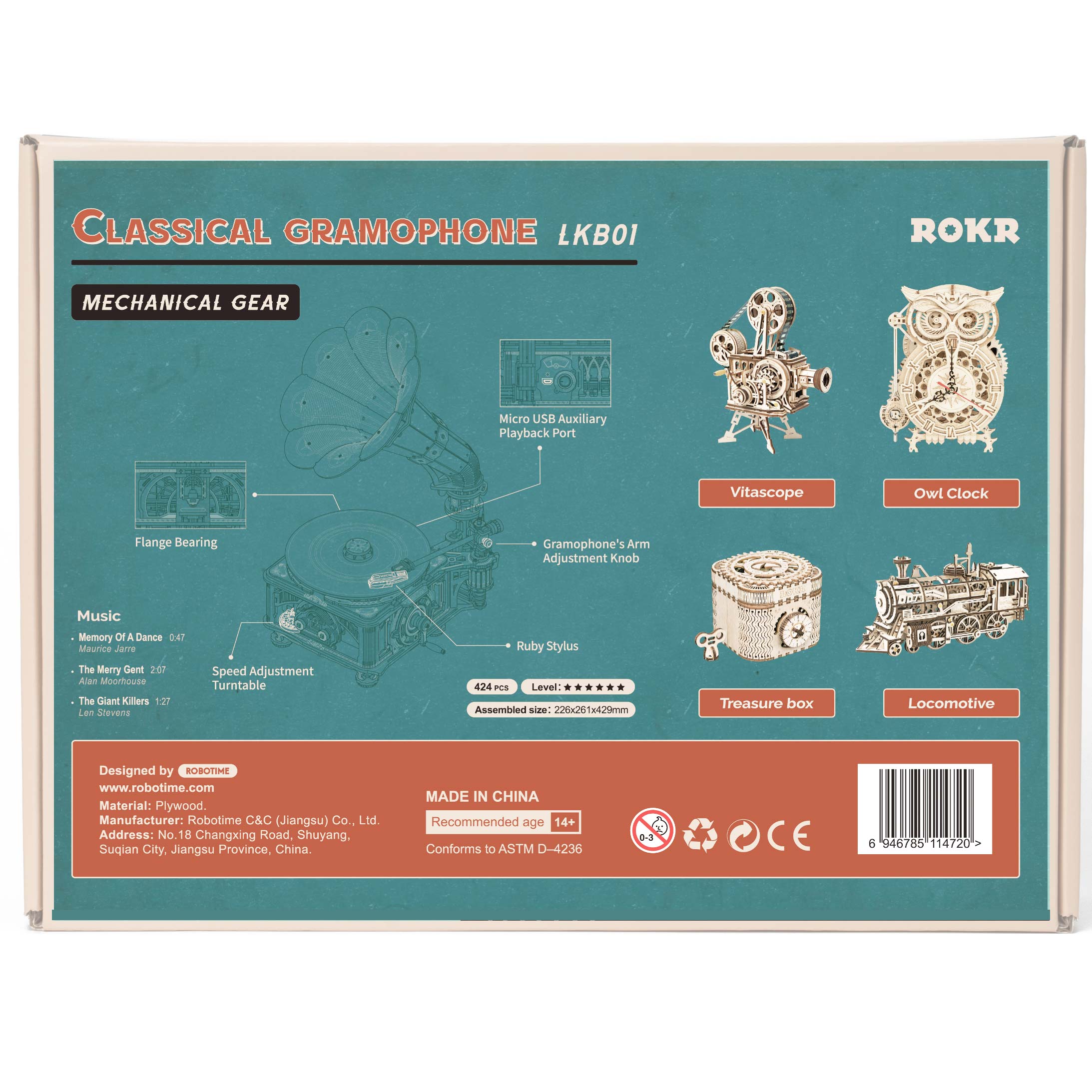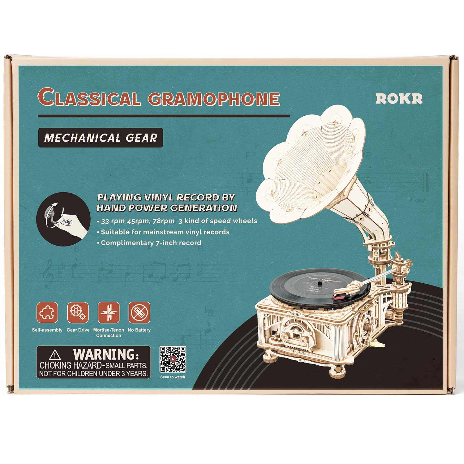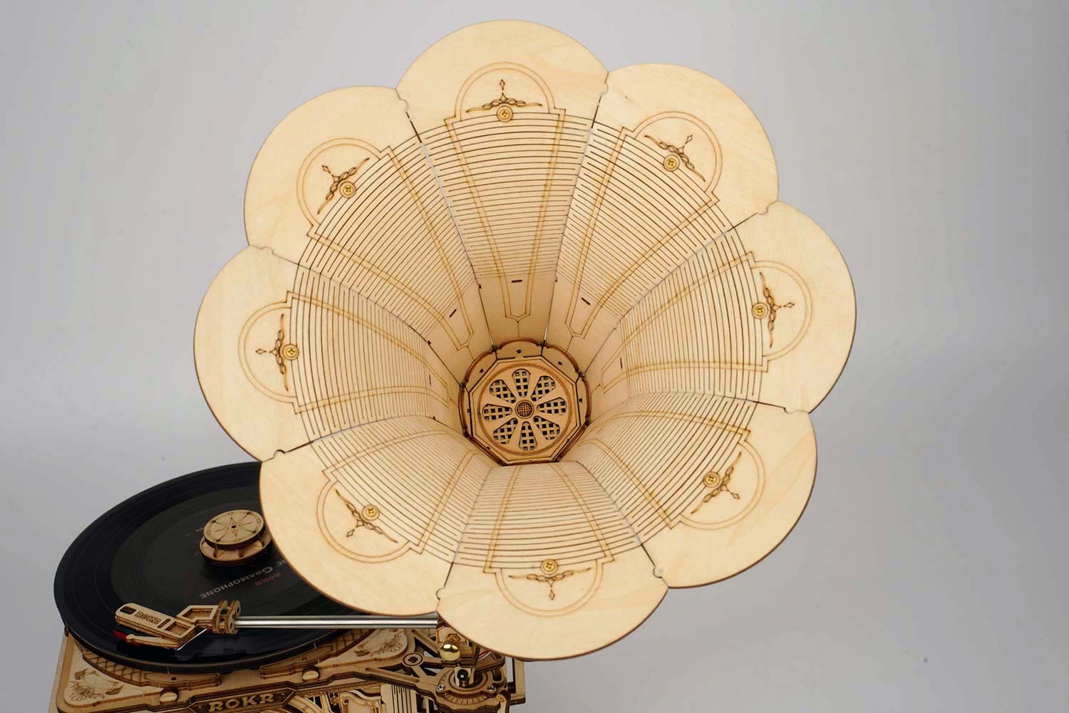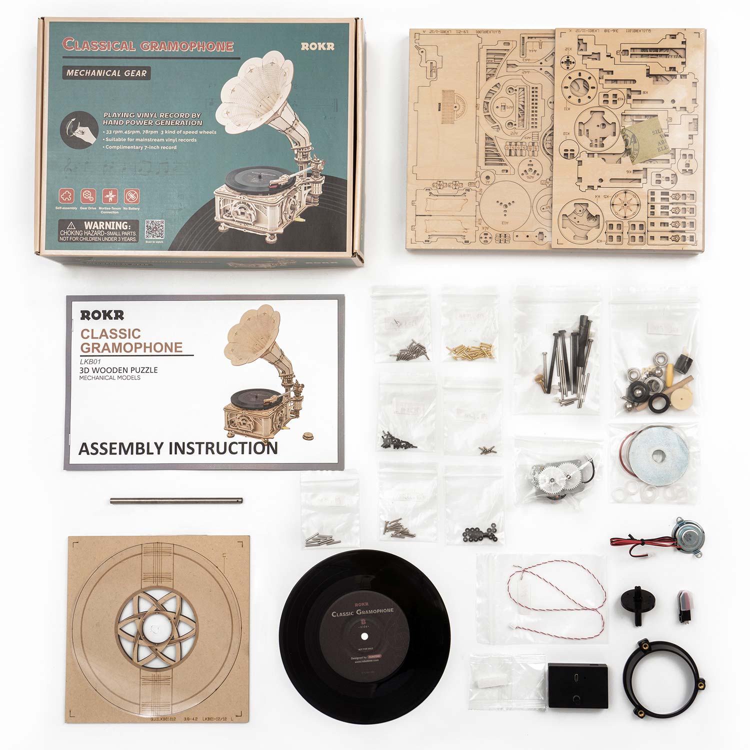 Das Classical Gramophone von Rokr ist ein Bausatz für einen funktionierenden Plattenspieler. Die 424 Bauteile beinhalten neben den Holzteilen für die Optik auch alle elektrischen Bauteile für das Abspielen der Schallplatten. Das Grammophone spielt herkömmliche Platten ab, außerdem ist eine Schallplatte im Bausatz enthalten. Die notwendige Energie erhält der Plattenspieler durch das manuelle Drehen an einer Kurbel. Das zusammengebaute Gerät verfügt über einen Hebel für die Geschwindigkeit und einen USB Anschluss.